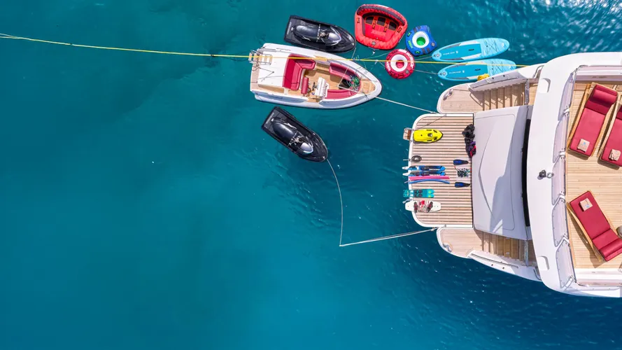 The expansive flybridge features U-shaped seating, spa tub, wet bar and sunbathing areas under a custom hardtop with retractable canopy, while the cockpit provides excellent al fresco entertaining space with upholstered seating and dining for eight. Professional crew quarters for six and comprehensive water toys complete this exceptional package.