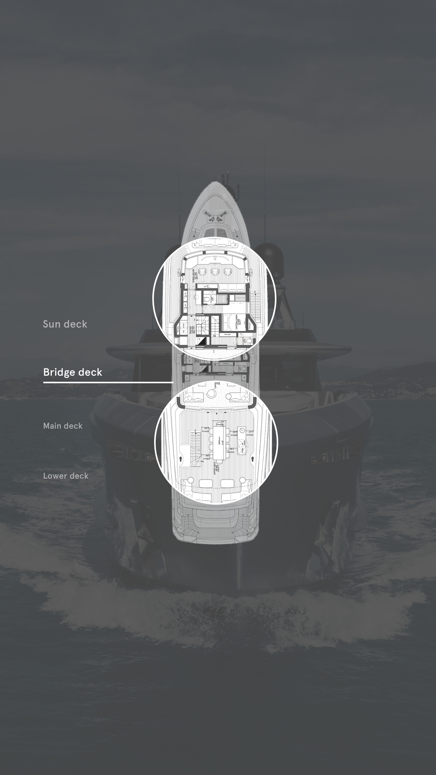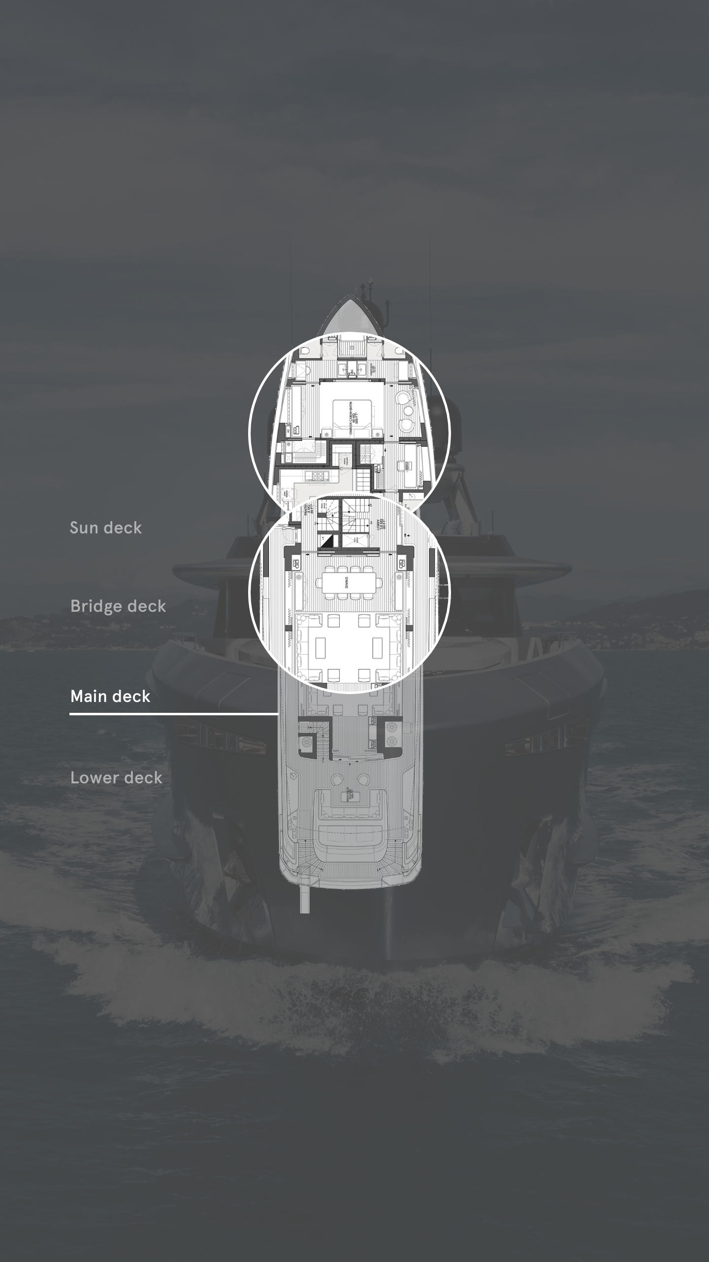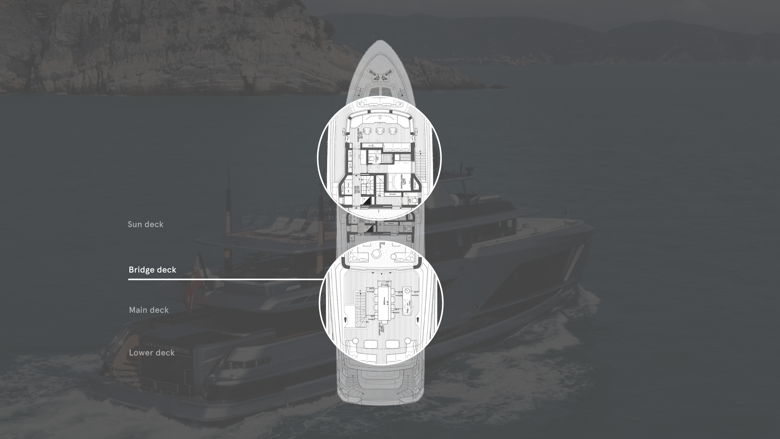 Clever deck layouts and internal configuration by the design teams have also played a role here. With no side decks to chip away at the forward part of the main deck, the owner’s rooms stretch across the boat’s full beam. The same tactic is used on the upper deck, where the aft saloon, pantry and captain’s cabin make use of the deck’s full width.