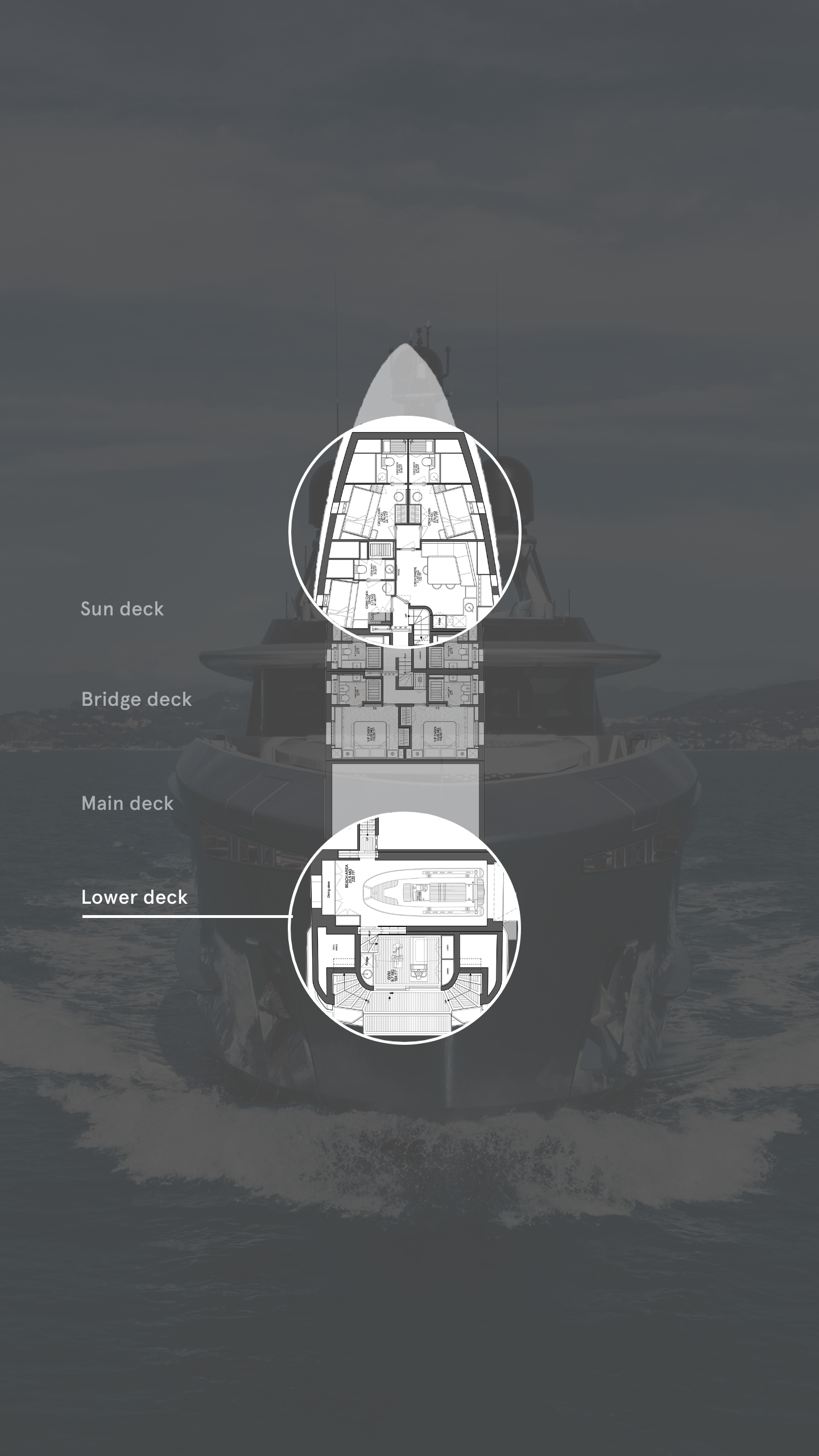 A floating steel and wood staircase gives access to more formal dining area on the aft deck below, with a horseshoe of comfy seating built into the main deck below that. The beach club, reached down the twin transom staircases, looks like a relatively modest affair – until you realise that it harbours a fold-out hydraulic platform. It keeps another secret, too: the glass structure dominating the transom is a room with a sliding door, which is a kind of antechamber for swimming and watersports. Formally designated as a gym, with space for a treadmill and a weights trainer, the room has skylights as well.