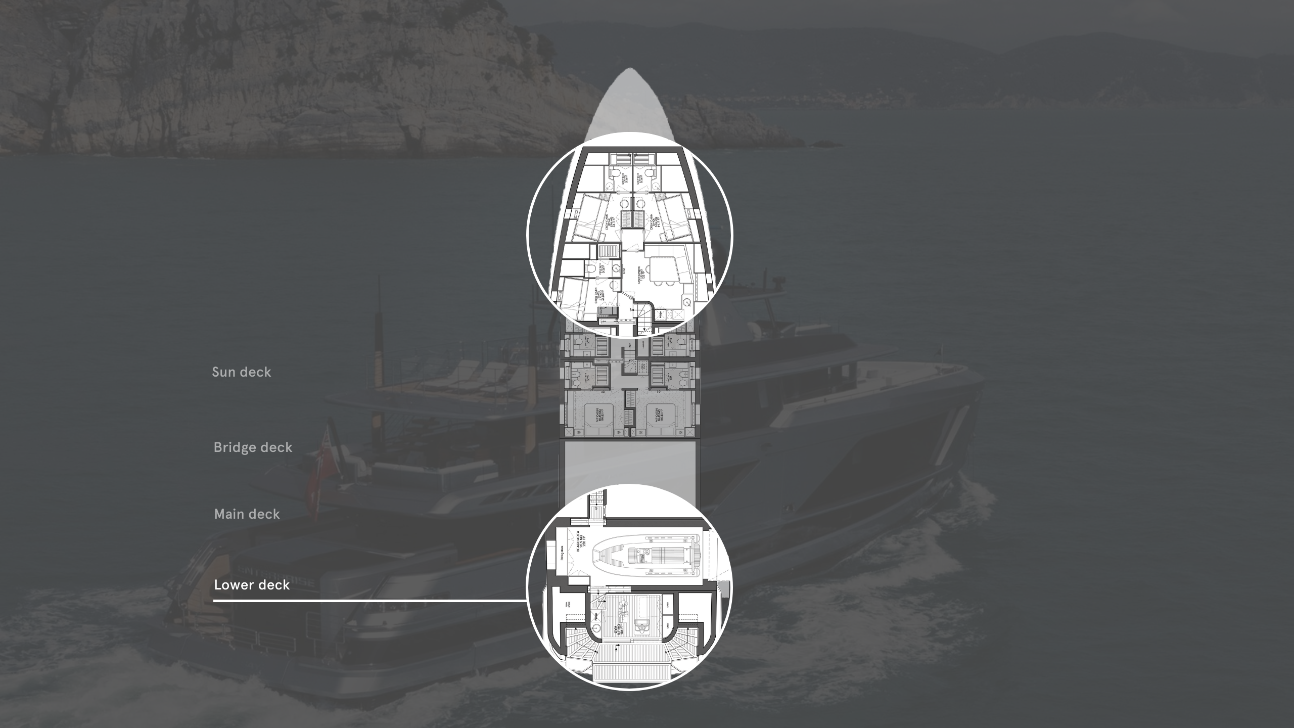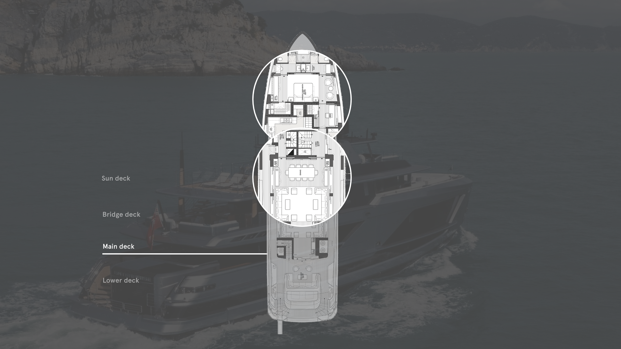 Another feature that Enterprise shares with a larger yacht, according to the hyper-involved Meshoulam, is the galley. It fills a generous 14.2 square metres and boasts three fridges and freezers, including a large walk-in cold store that fits into a well-insulated space between the galley and the owner’s cabin. There are twin dishwashers, a dumb-waiter system connecting all decks and an oven/hob unit that would look thoroughly at home in a restaurant kitchen. “They like very healthy food,” Meshoulam says. “The owner also plans to have lots of parties on board, so the dumb waiter goes right to the sundeck and the galley has fully automatic doors.”