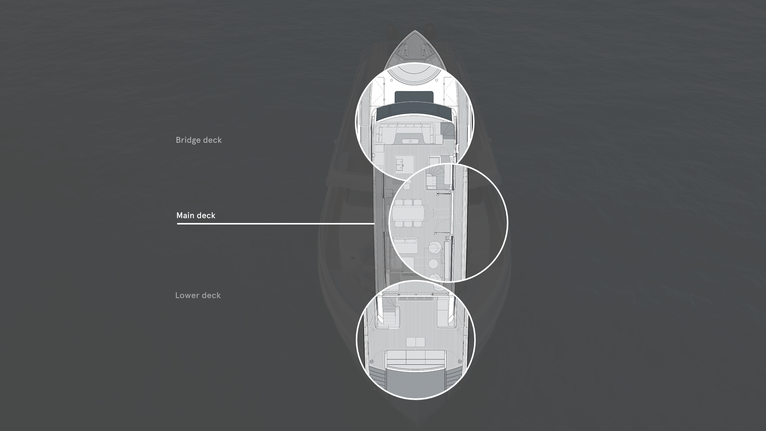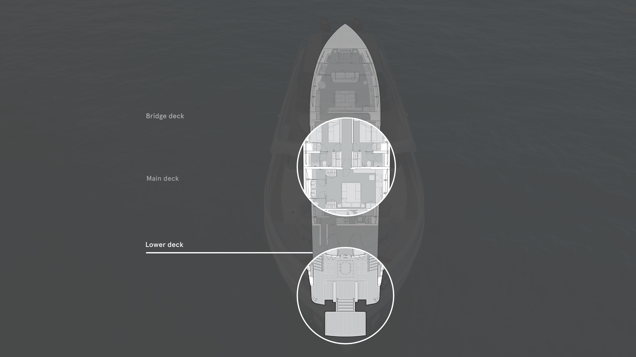 The visit starts from the transom and its multi-purpose platform by Z-lift, which handles up to 800 kilograms and accommodates a tender of up to 4.4 metres; a davit is hidden nearby to assist with the tender launch. From here, we move up the stairs to the main deck, where the set-up is pleasantly casual. Sofas with storage underneath easily extend to allow tall adults to fully stretch out. “Transformability and multifunctionality are a theme throughout the whole boat,” Forakis says.