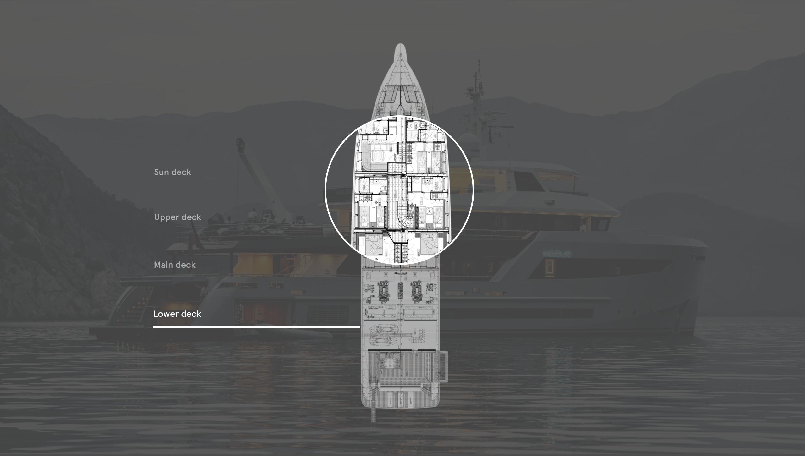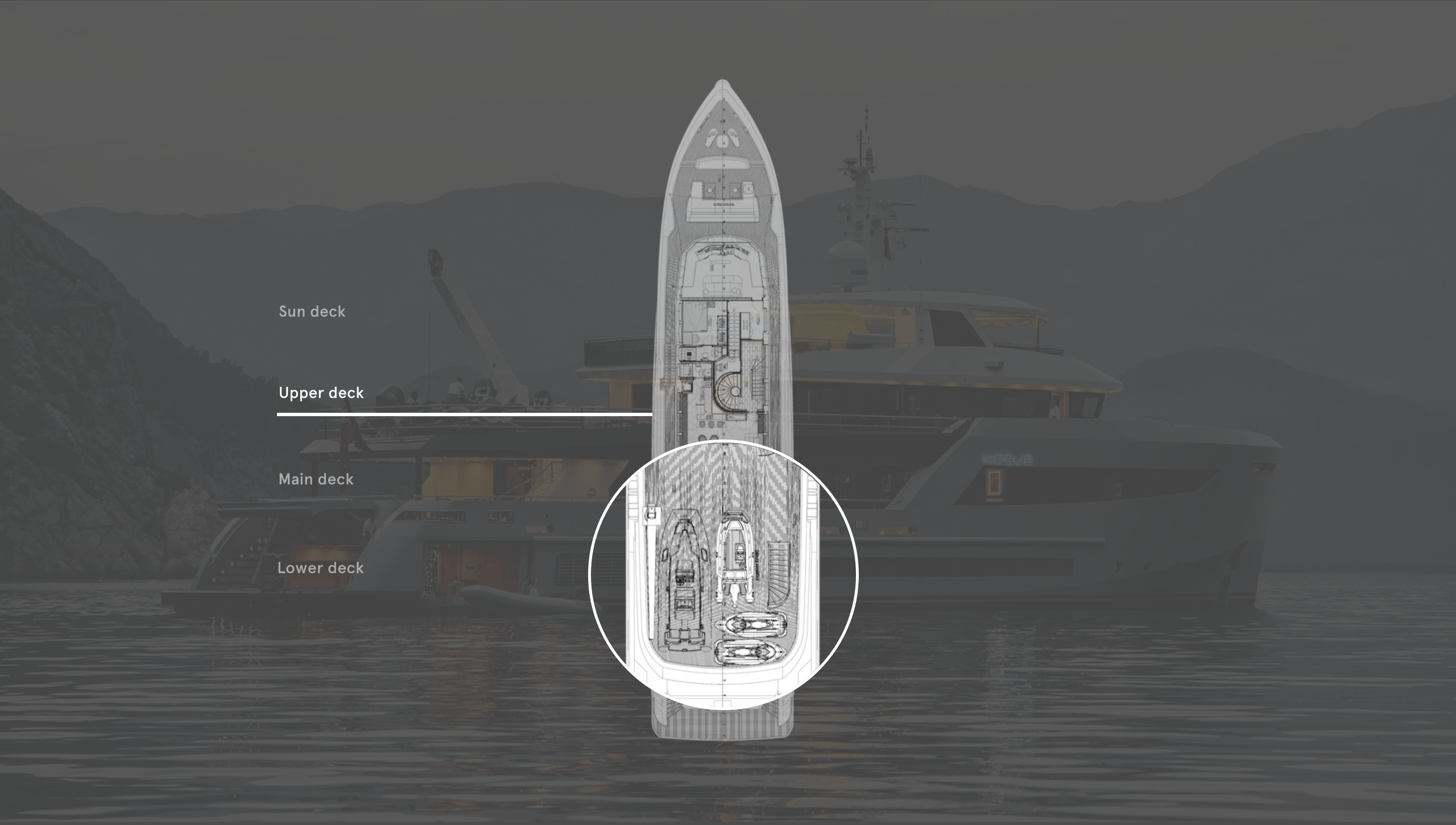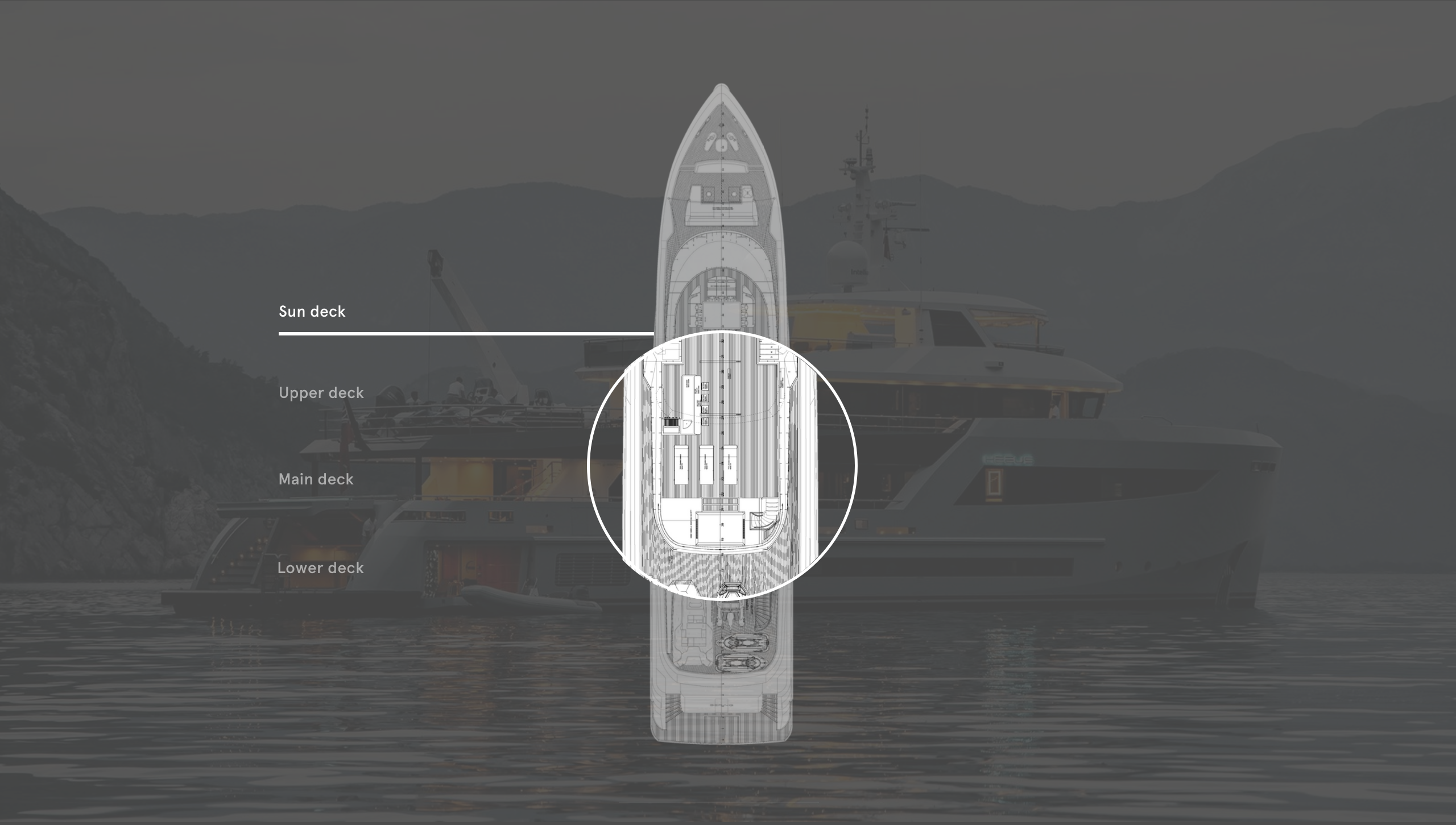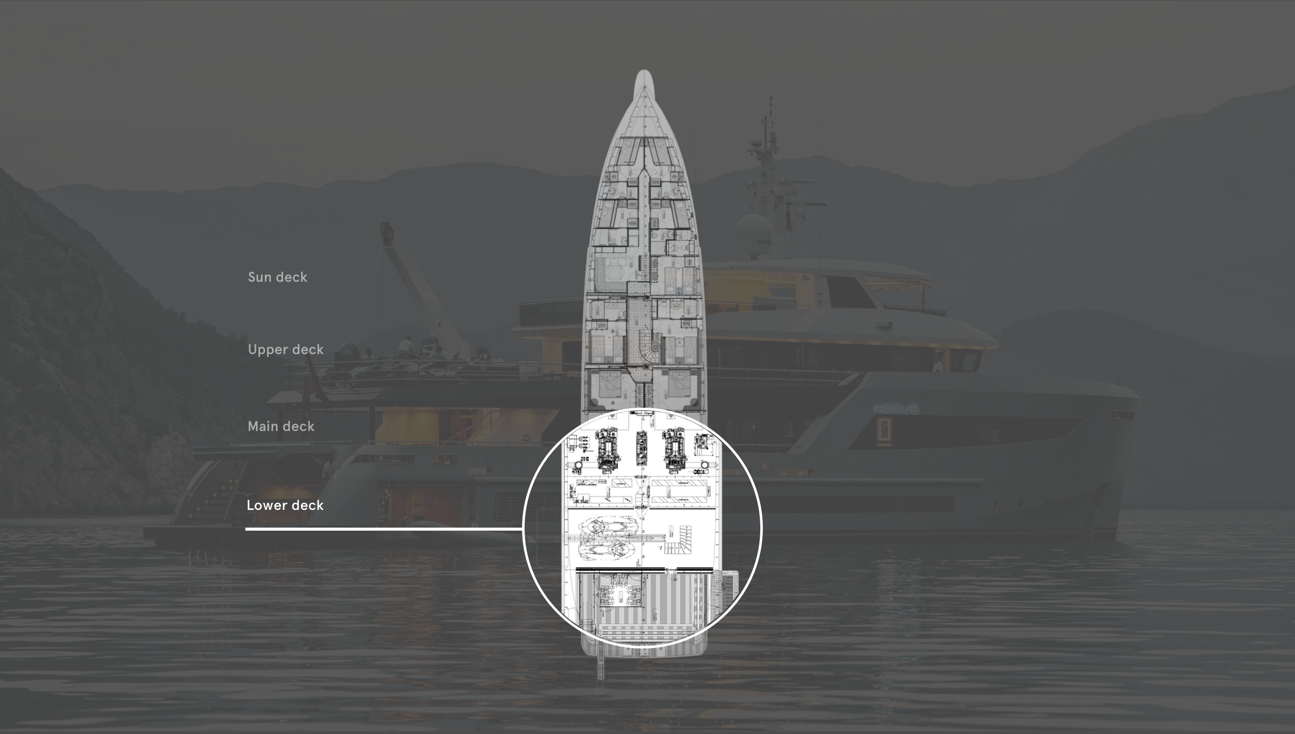 The lower deck areas near the transom include a small hammam with room to spare for more water toys or scuba gear, depending on the owner’s requirements. The arrangement also creates space for battery storage to power the hybrid propulsion system. A 40-square-metre beach club with a large terrace door connects to a swim platform with an integrated high/ low platform for entering the sea.