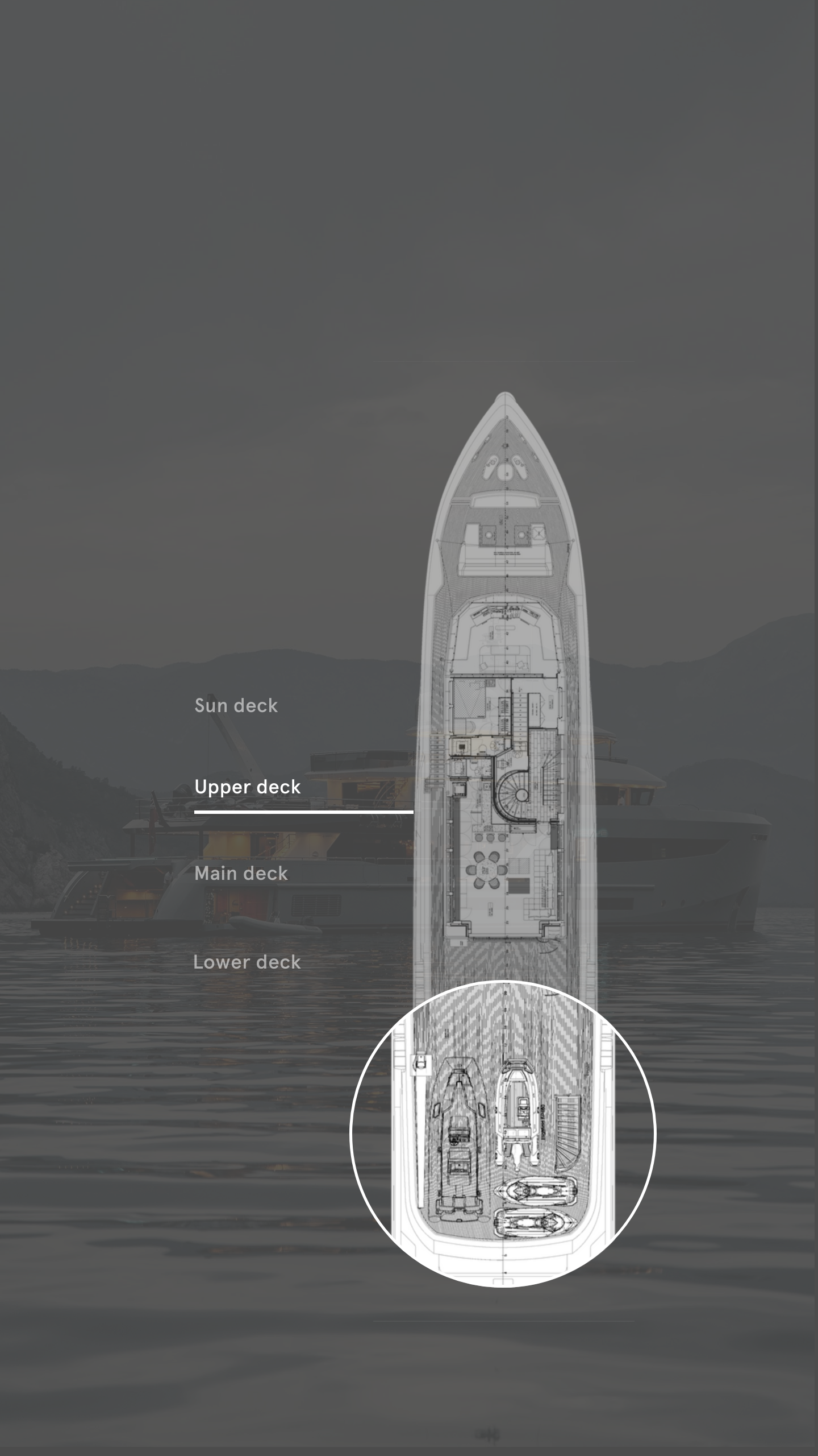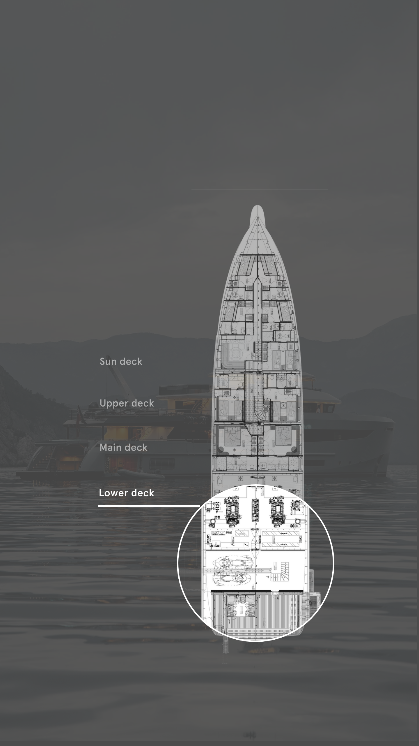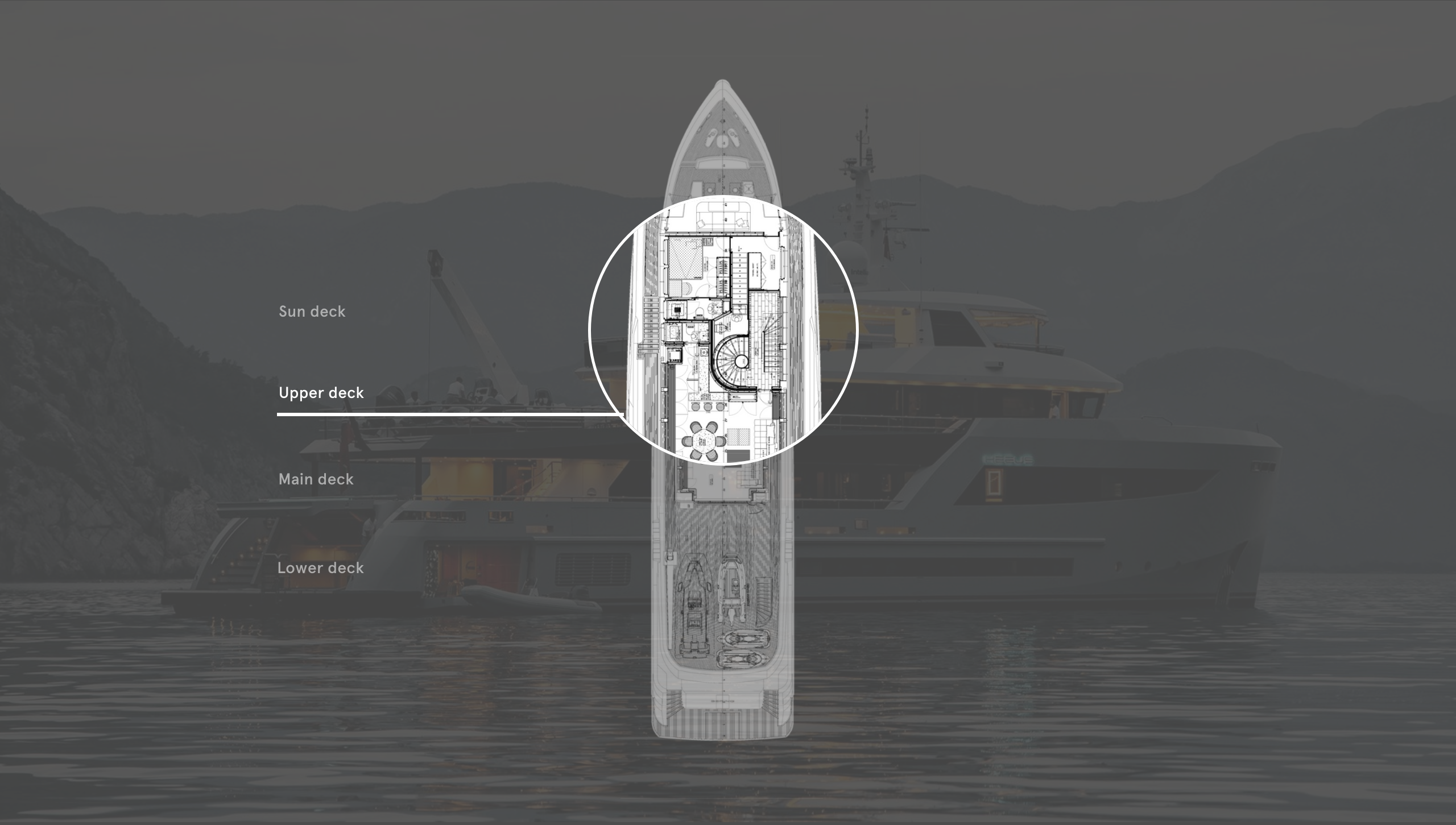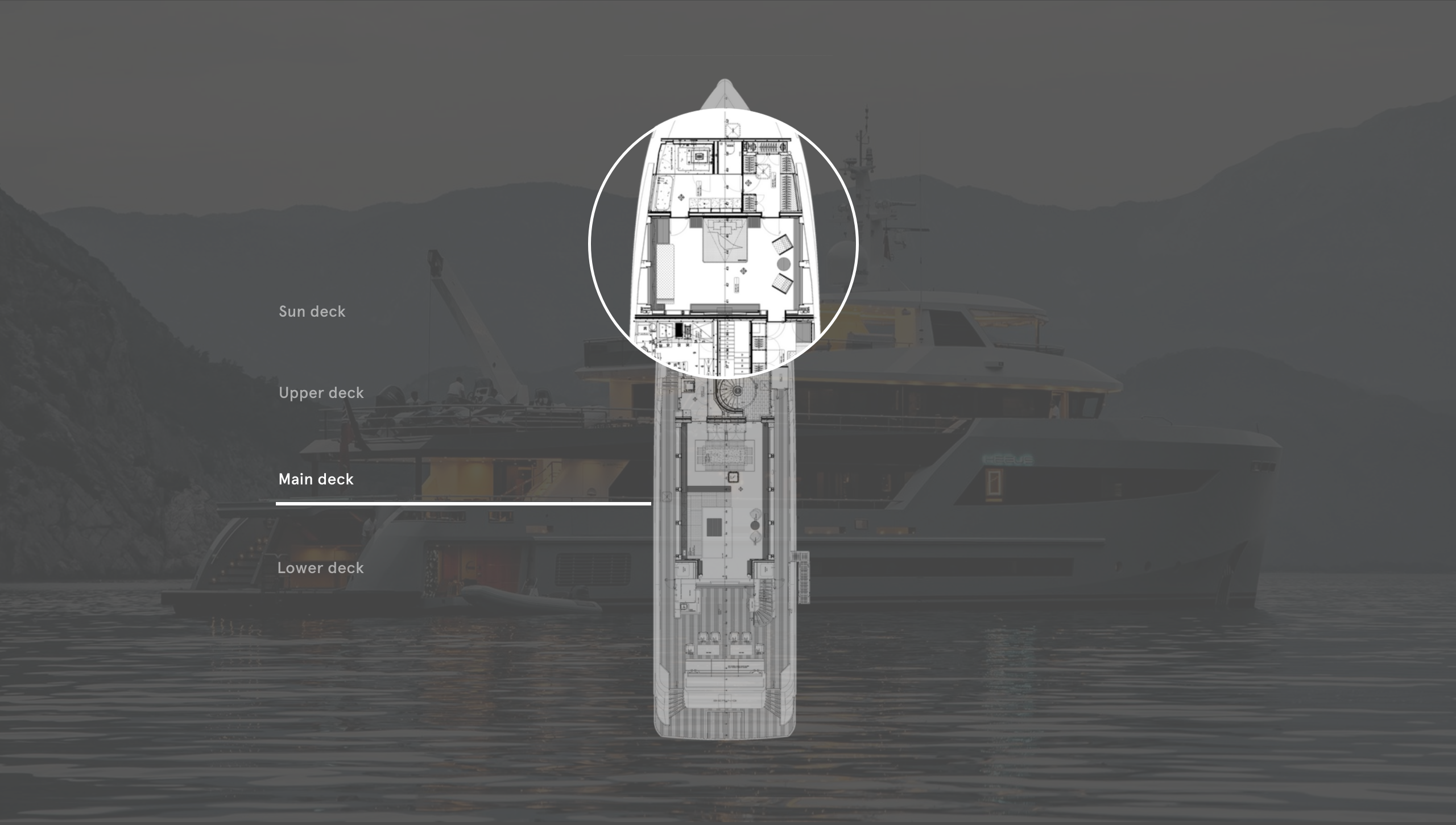 The lower deck areas near the transom include a small hammam with room to spare for more water toys or scuba gear, depending on the owner’s requirements. The arrangement also creates space for battery storage to power the hybrid propulsion system. A 40-square-metre beach club with a large terrace door connects to a swim platform with an integrated high/ low platform for entering the sea.