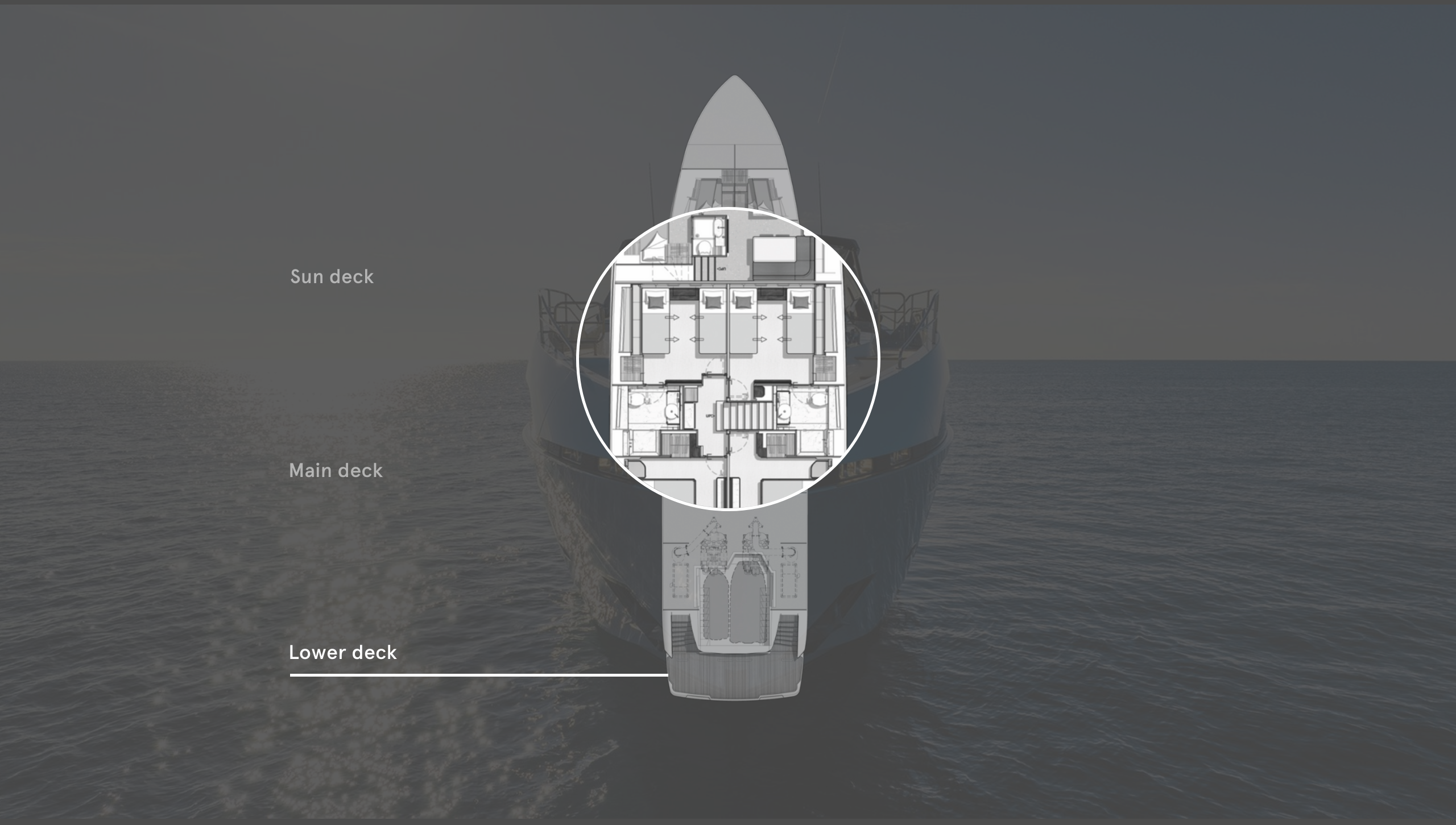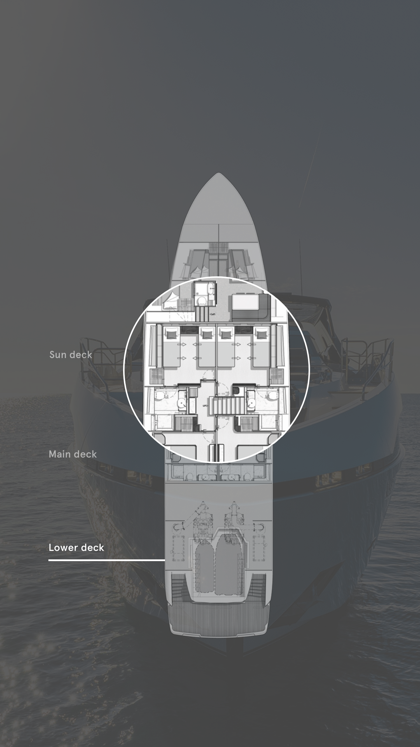 The Sunseeker 100 has a standard four-cabin layout available on the lower level. The staircase, however, is a bit more of a feature by design. “The (staircases) are directly above each other and act in unison to create a light airy feeling, with loads of natural light,” Tucker says. “The stairwell can be quite dark, so we made floating steps that let light come through from both port and starboard and flood into the stairwell below.”