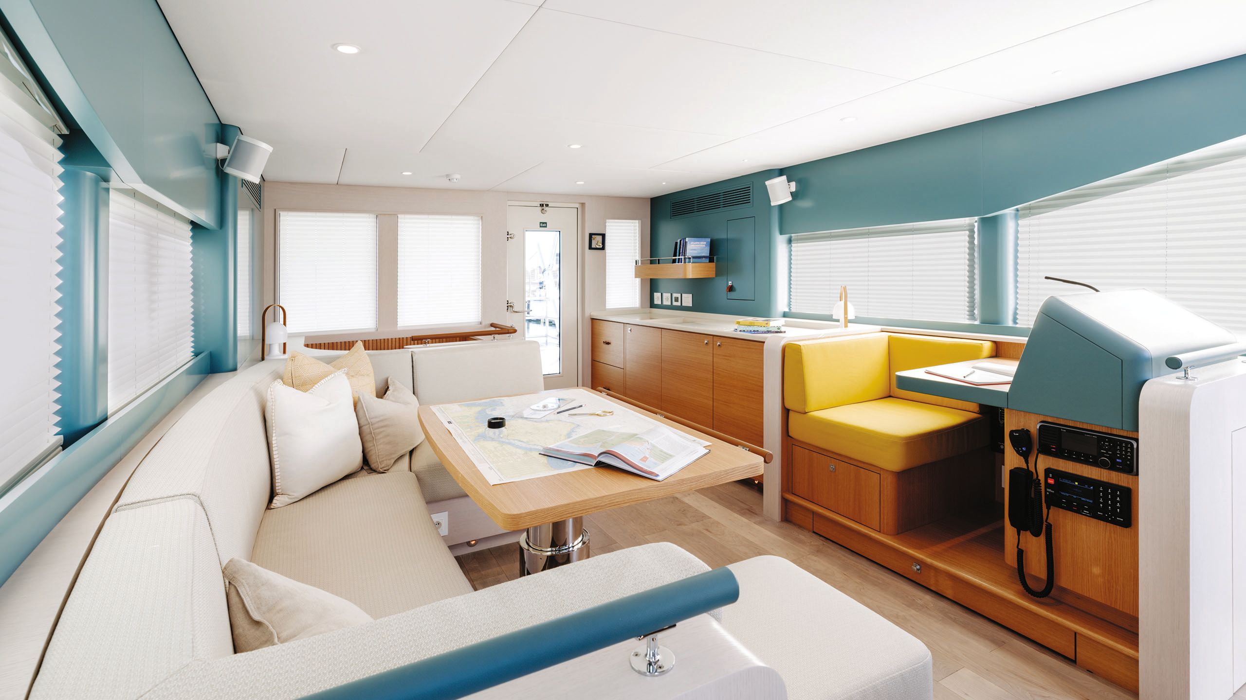 As hull No 2 is planned primarily for family use in the Med, there are more al fresco dining spaces, for example on the aft upper deck, which took away the need for a full dining room in the saloon. Instead, the main saloon of the second hull has a laid-back seating area where the family can unwind and play games.