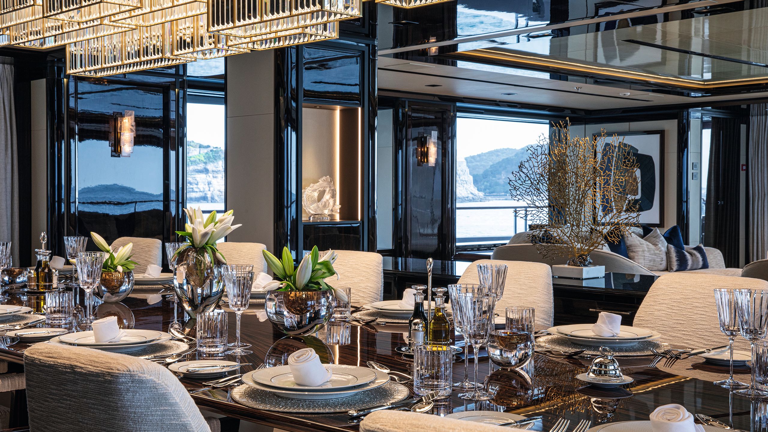 The interiors by Sinot Yacht Architecture & Design are sophisticated and elegant with a monochrome colour palette and an art deco aesthetic. The main deck saloon has a seating area that flows into a formal dining area forward. Mother-of-pearl, ivory parchment and Foglizzo custom leather add a touch of the natural world to the decor