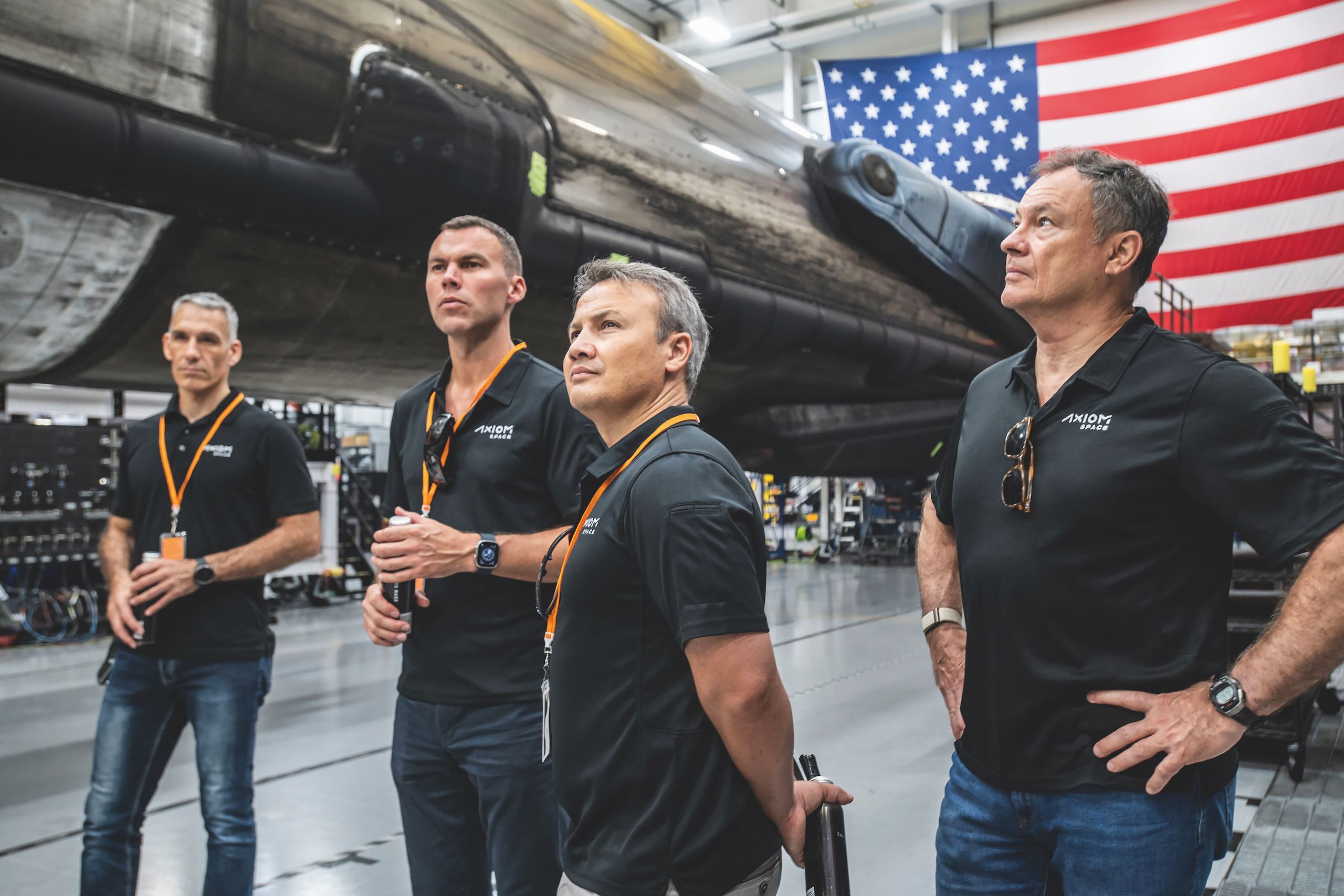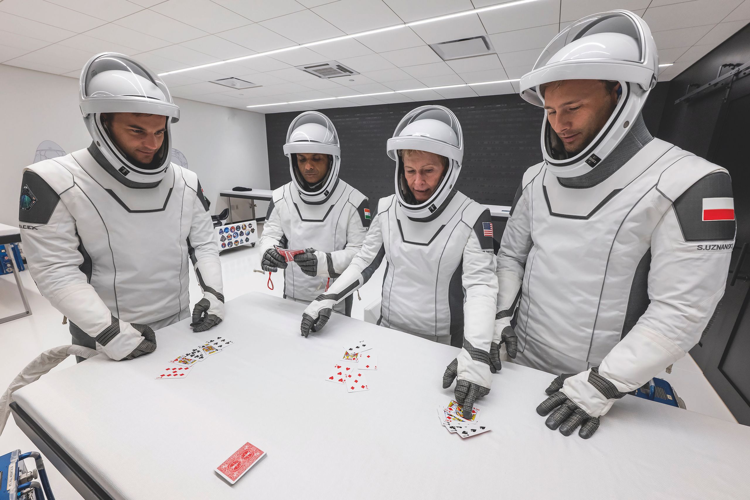 COURTESY OF SPACEX (l-r) Private crew of Axiom 4, who spent 18 days on the International Space Station, the crew playing cards as part of their training and the Axiom Space hangar