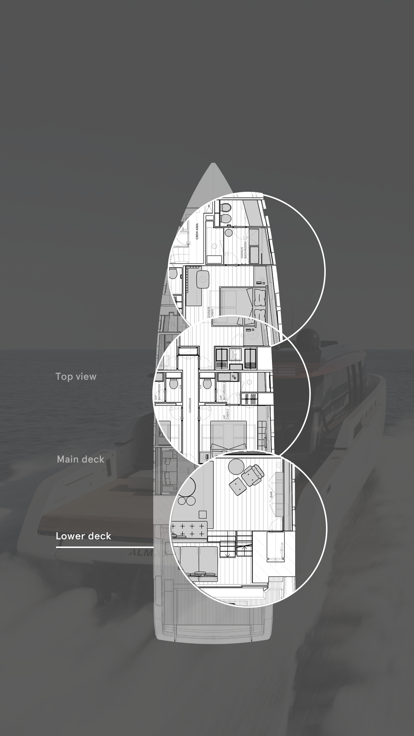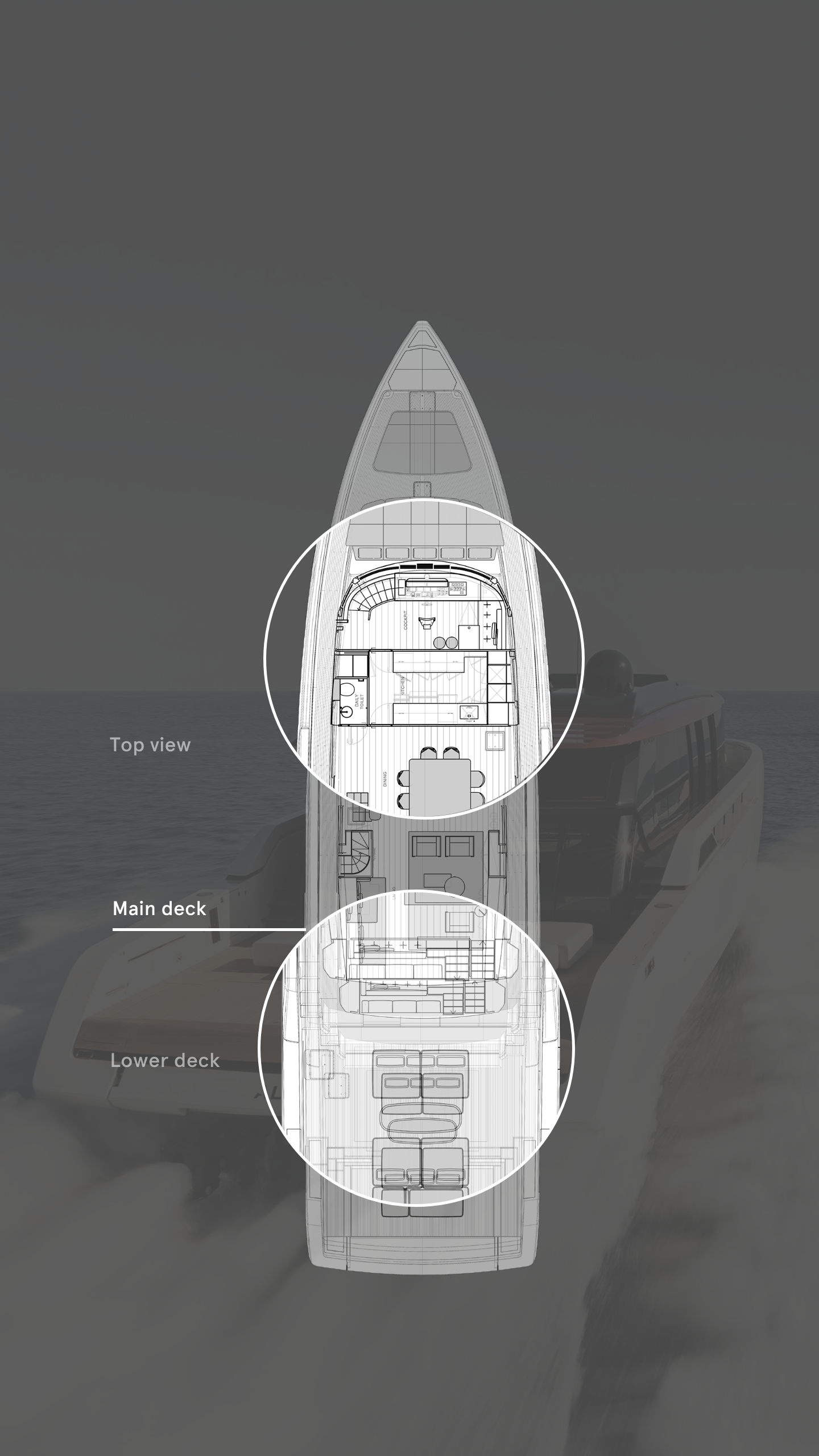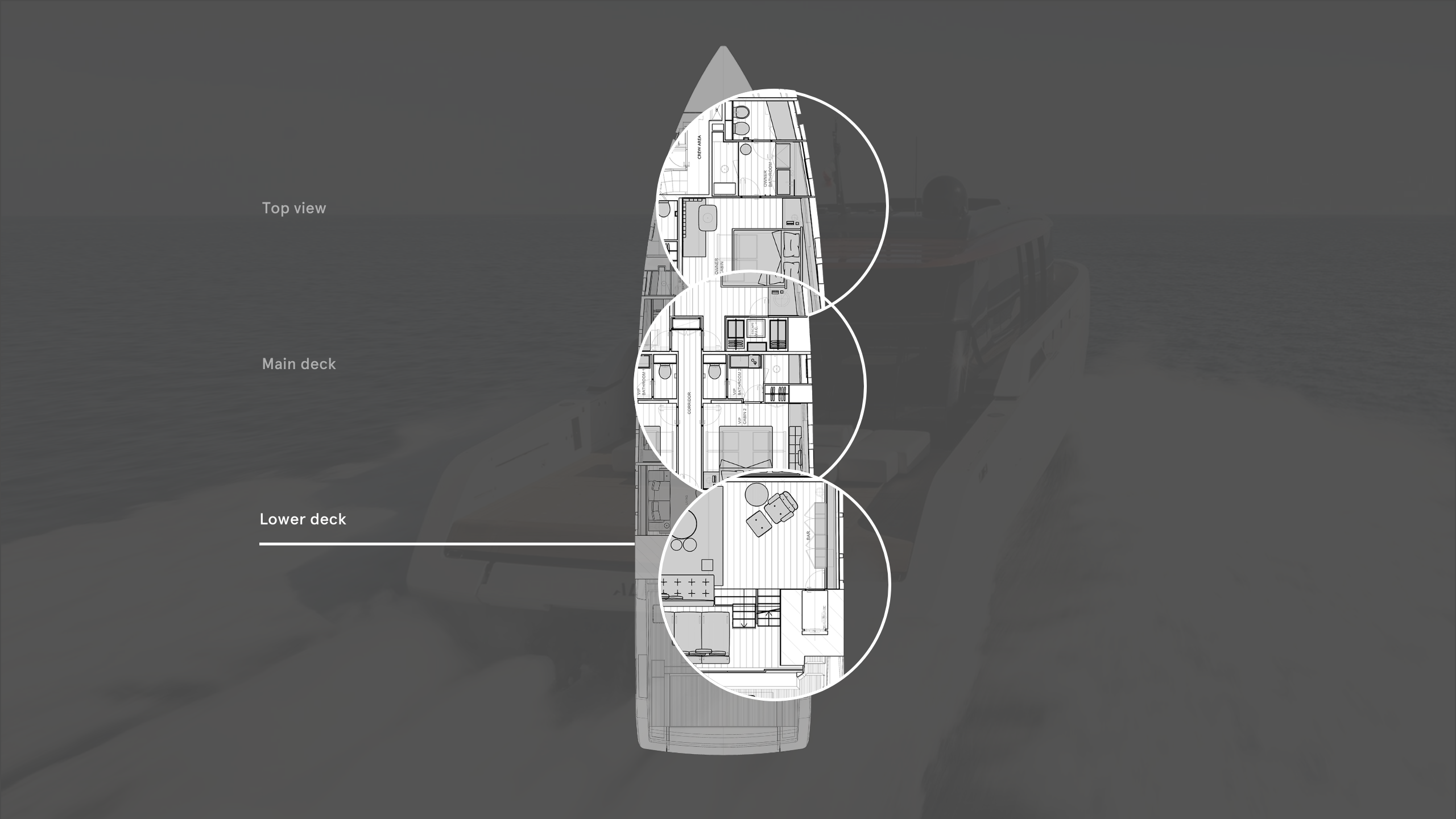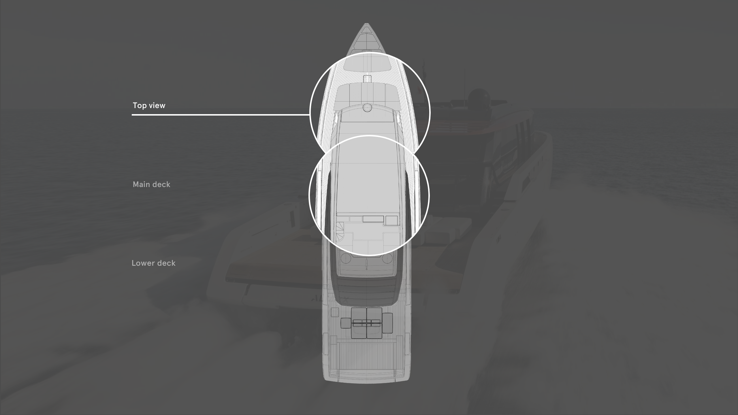 Standing on the aft deck, you can see into both the lower deck lounge (bottom right) and the main deck lounge. The stairs and the swim platform recede, leaving nothing but a flush, open space separated from the inside via a giant glass door. A vital part of the brief was maintaining good seakeeping in heavy seas, with a soft ride while achieving a cruising speed of more than 30 knots