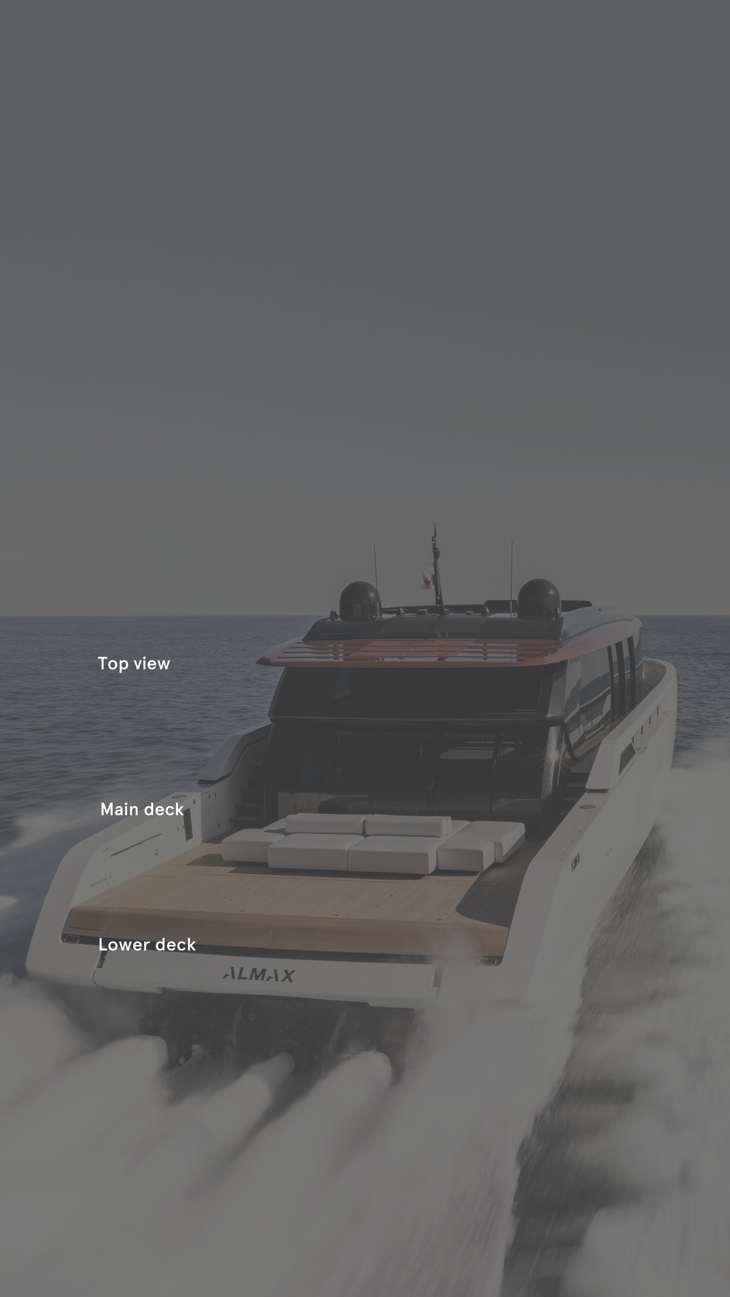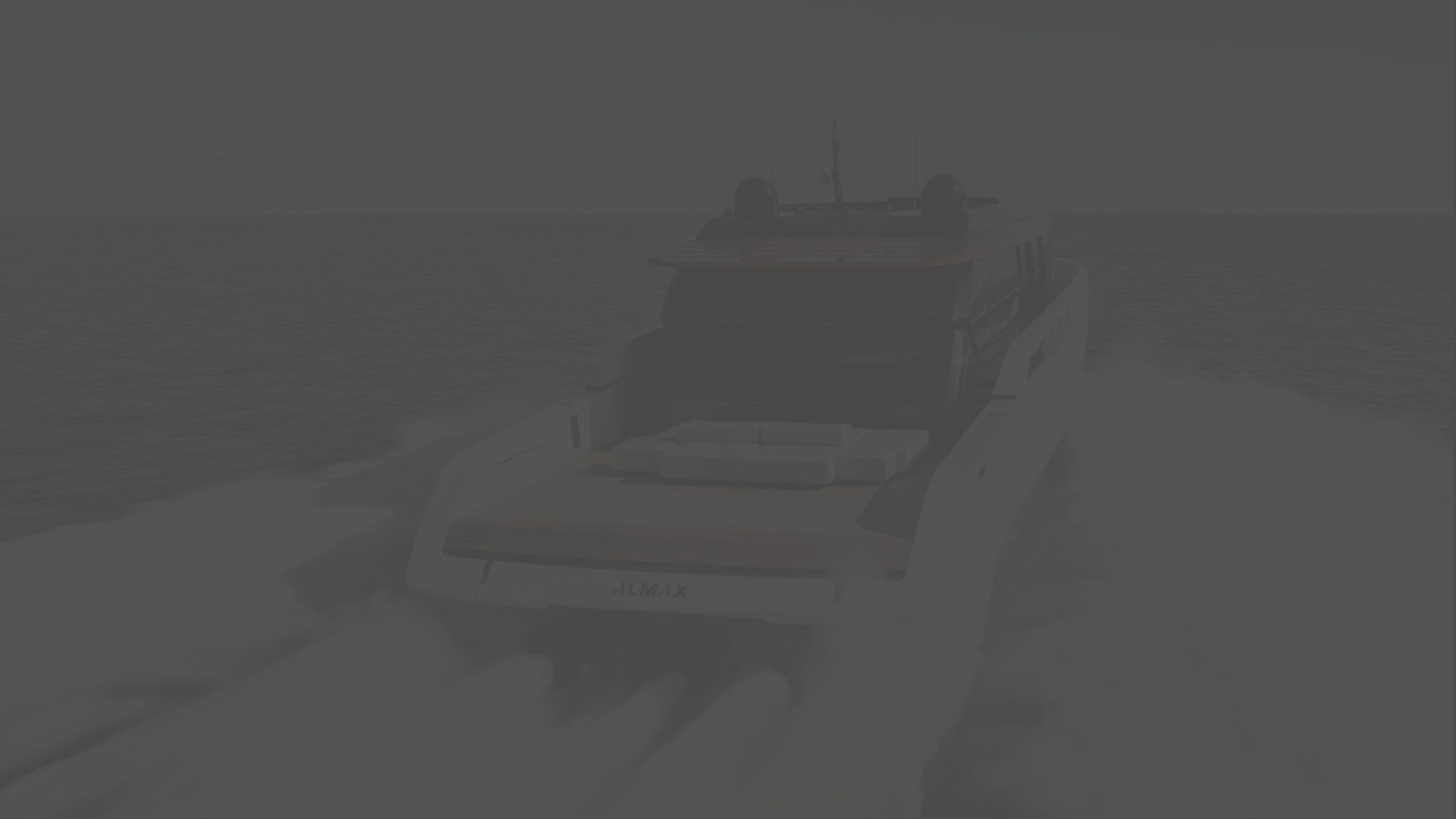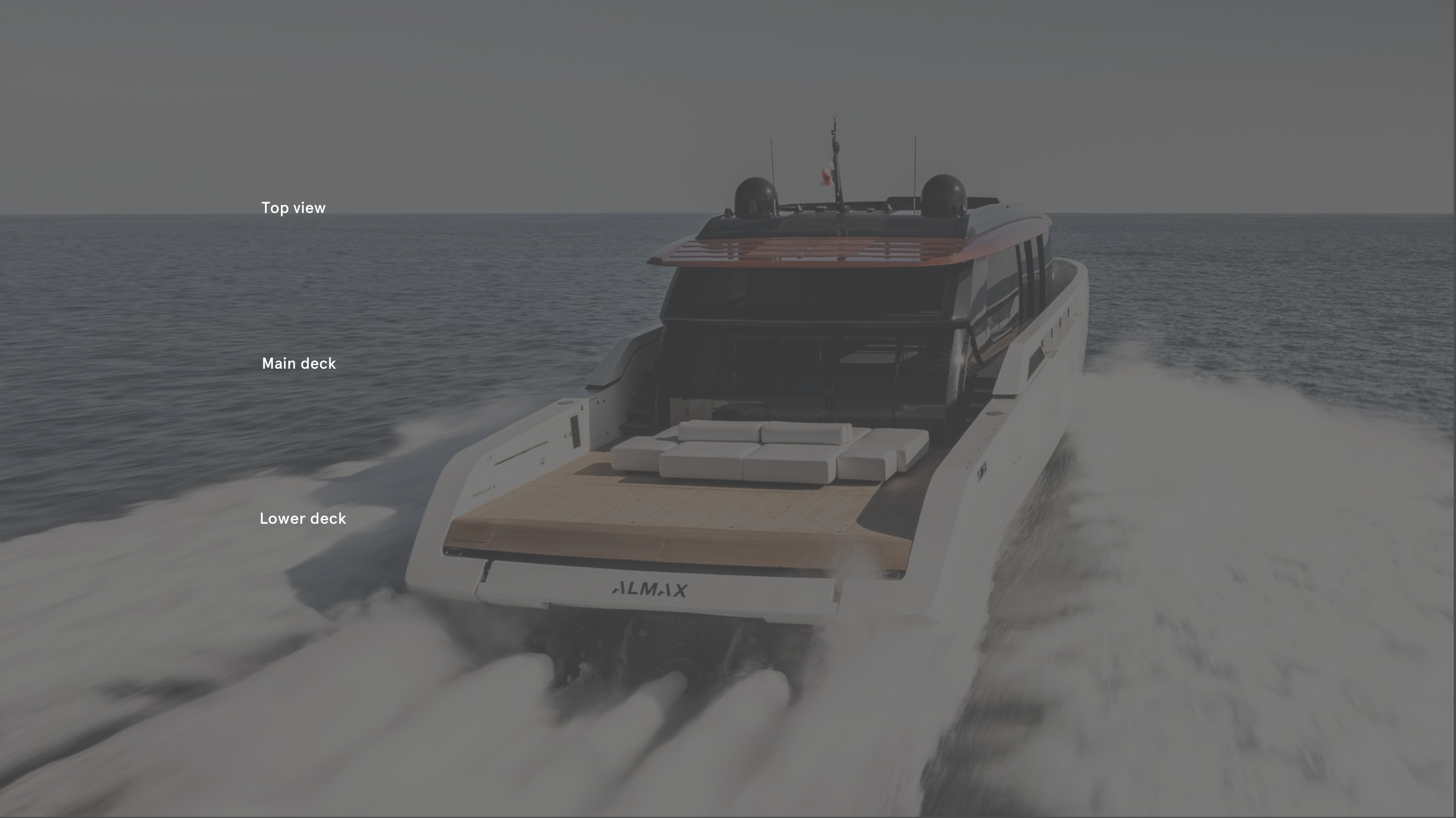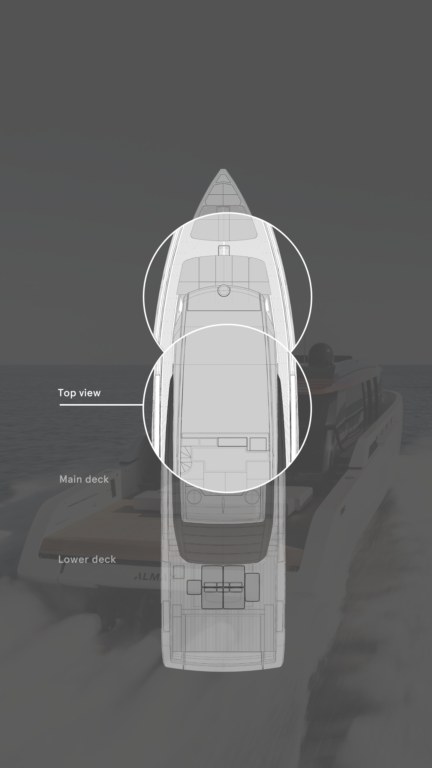 Standing on the aft deck, you can see into both the lower deck lounge (bottom right) and the main deck lounge. The stairs and the swim platform recede, leaving nothing but a flush, open space separated from the inside via a giant glass door. A vital part of the brief was maintaining good seakeeping in heavy seas, with a soft ride while achieving a cruising speed of more than 30 knots