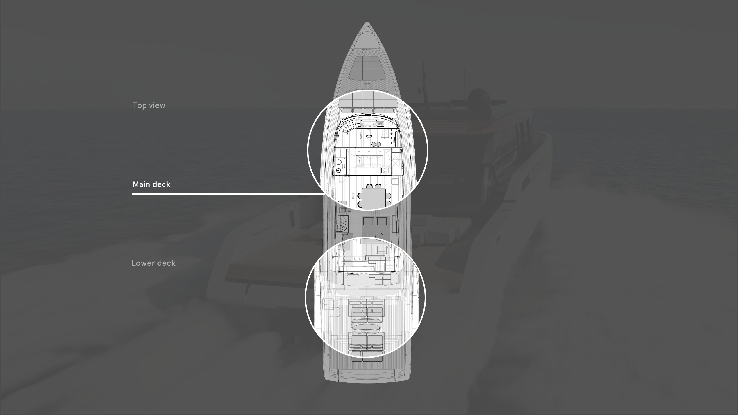 “By going down one metre and up one metre, we managed to have different living areas inside, but from the outside still have the feeling of a coupé,” Perotti says. When the aft wall of the yacht slides open, both living areas are exposed to the exterior deck. Sightlines stretch from the main deck dining area out to the swim platform. “While using the boat, as I have this summer in the Med, [I noted that] people can be inside and outside in different areas but still see each other and feel connected,” Perotti says.