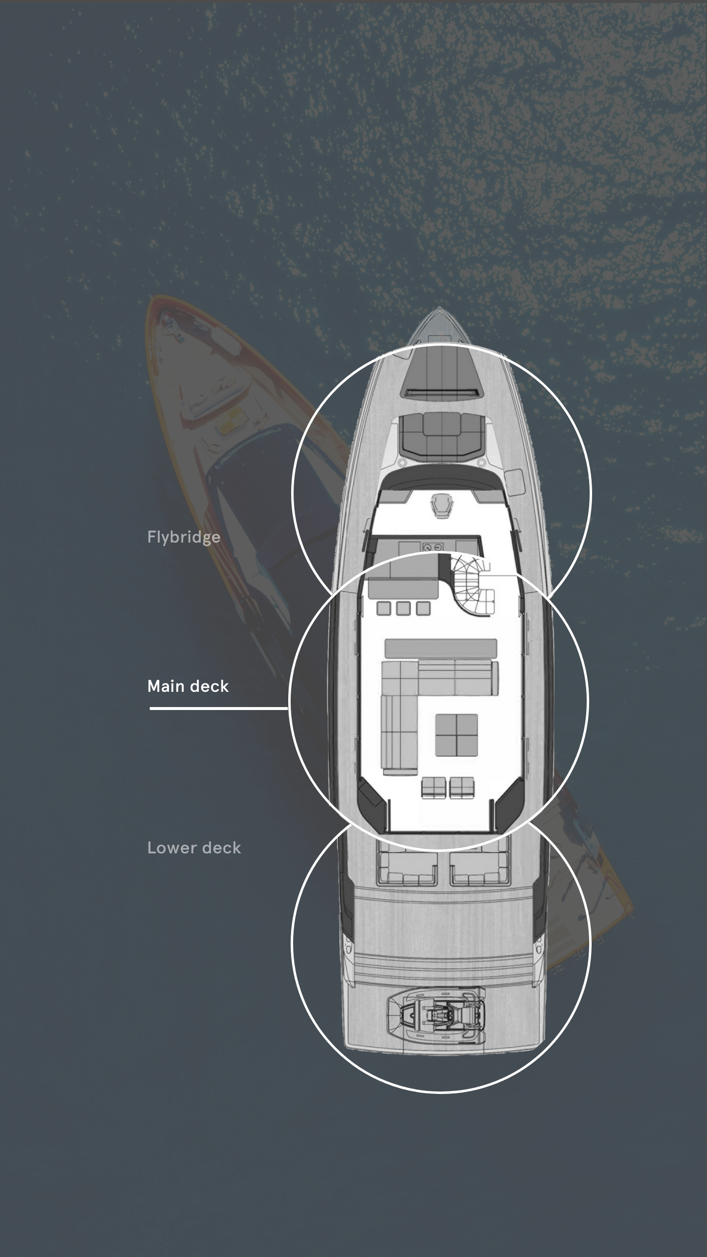 In many ways, the exterior profile is defined by its windows, with a distinctive wheelhouse that juts forward, contrasting the straight and flush main saloon side windows. The glazing on the main deck is notably expansive, stretching beyond mere floor-to-ceiling boundaries as the glass wraps up and over the superstructure itself, allowing light to stream in from the ceiling. The reflective windows are so cleanly flush that you might never guess they are really doors, which open by sliding forward and then to the side. With doors opening to port, starboard and aft, the main saloon becomes an open-air living area that’s well connected to the multi-level aft deck. “The entire main deck opens up as a true entertaining platform,” says Sandan.