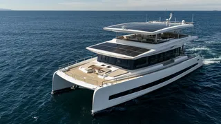 Twin Danfoss electric motors and a bow and stern thruster provide "exceptional agility and control", with cruising speeds of between six to eight knots. Thanks to her additional solar panels, the second model from the series is equipped with 63 solar panels that continuously charge her batteries and generate up to 25.2kW per hour, allowing her to cruise without depending on external power.