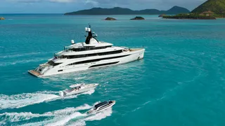 Felicità was launched in June last year as the fifth unit from Mangusta's Oceano 50 series – the flagship model from the drawing boards of Italian designers Alberto Mancini and Pierluigi Ausonio. Following her launch, eyes were drawn to her "expansive" beach club, which opens on three sides and contains a blue marble and mosaic-tiled Hammam. Visitors on board will also enjoy her contemporary, nautical-inspired design, her large glass-fronted, rectangular Jacuzzi pool forward on the sundeck and her "oversized" and well-equipped gymnasium. Felicità is on the market with Cecil Wright.