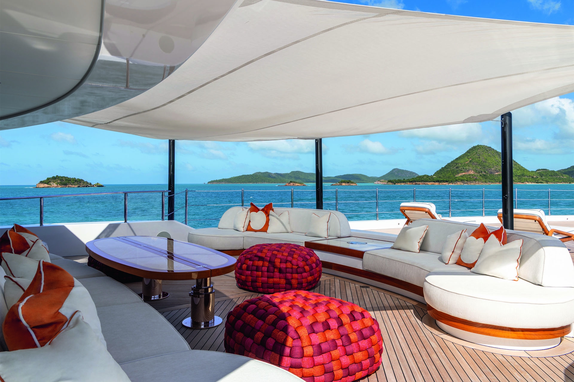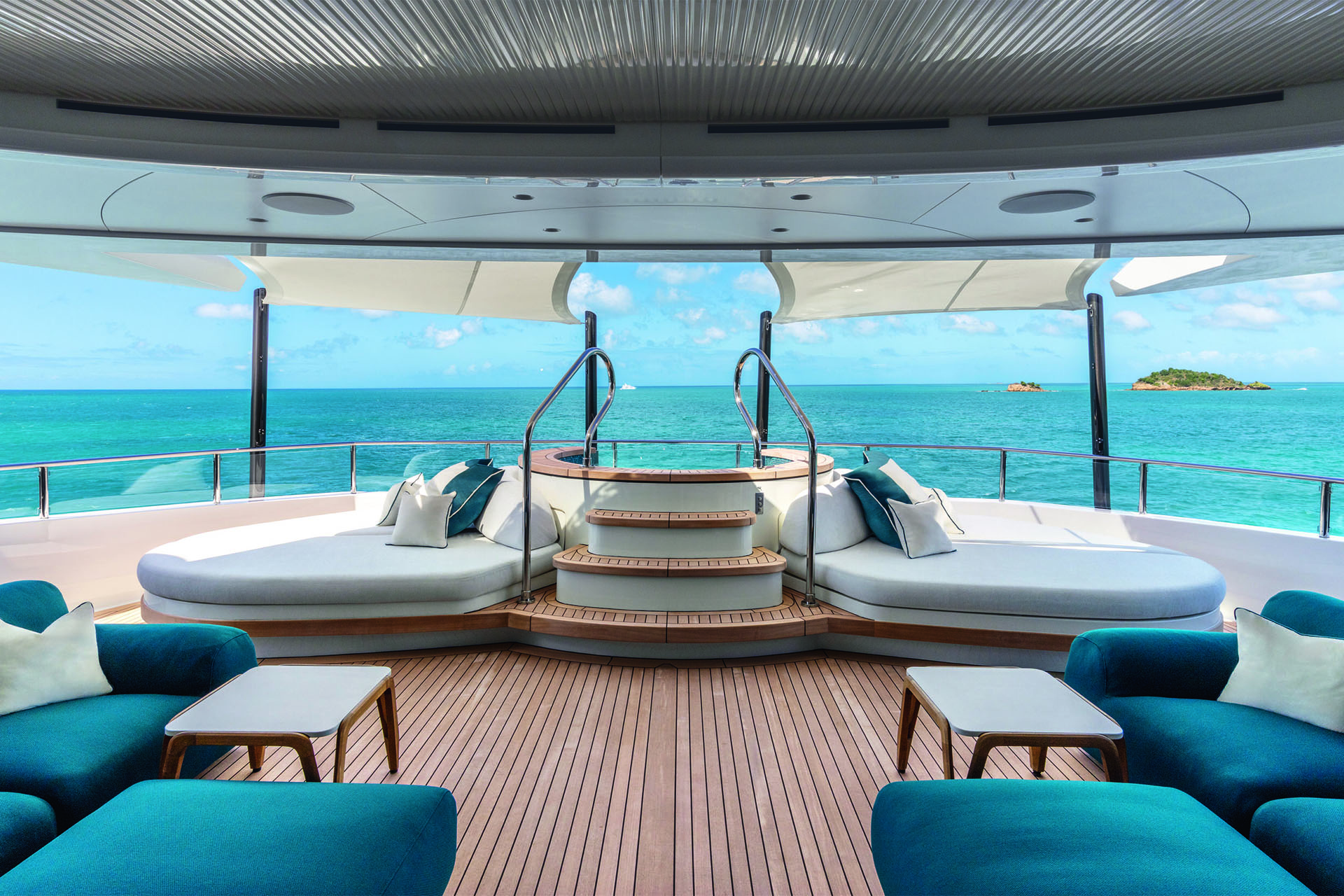 One level up is the owner’s deck. Here, oval aft seating embraces twin fire pits that might encourage s’mores. A large dual gas/electric barbecue nestles in a bar opposite an al fresco dining table, custom built by CRN, that extends to seat up to 18 guests, all served by exterior furniture from Neal Jones and Siebensee. An informal sky lounge with twin sofas and a large television serves as a casual family hub indoors.