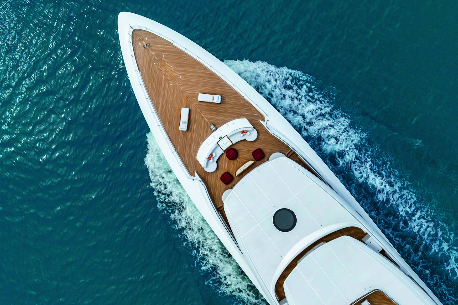 The main wood used on board is sycamore frisée. “It’s a light wood that, thanks to the particular cut, has a three-dimensional effect that gives a lot of depth,” Nuvolari says. Teak is also used on board, notably on the main deck to create a seamless flow between aft deck and the interior dining area, a feeling enhanced by creating flush thresholds for the aft and starboard side sliding glass doors thanks to using grating and concealed drainage rather than a lip seal.