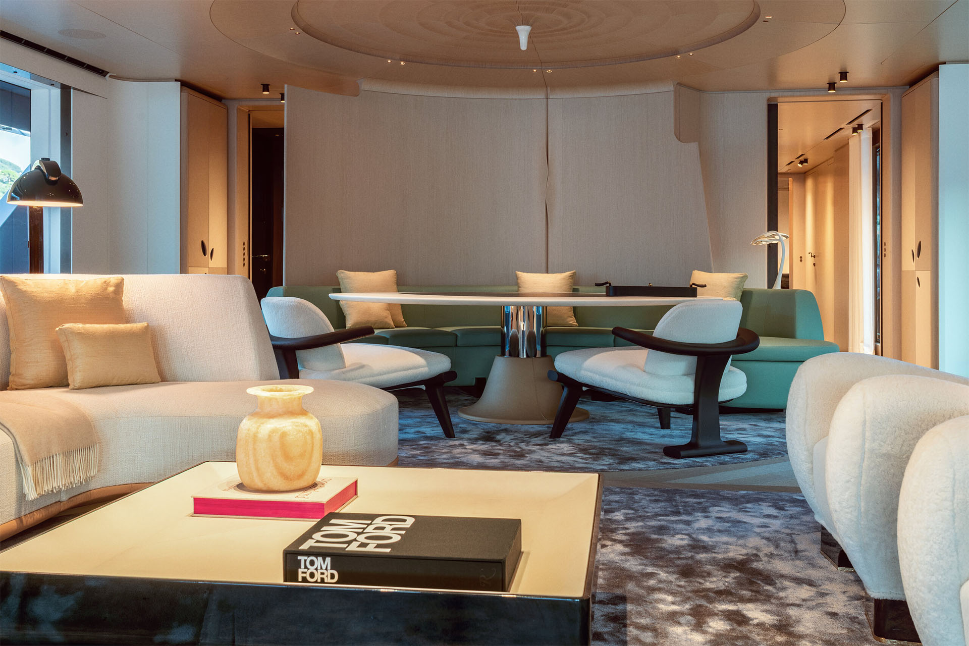 Flexibility has also been factored in for storage, which is discreetly built into the bulwarks and loose furniture, all of which is bespoke, designed by Salvagni’s atelier and crafted in-house by Cantiere delle Marche, from the tables to the sofa trays to the cabinets.