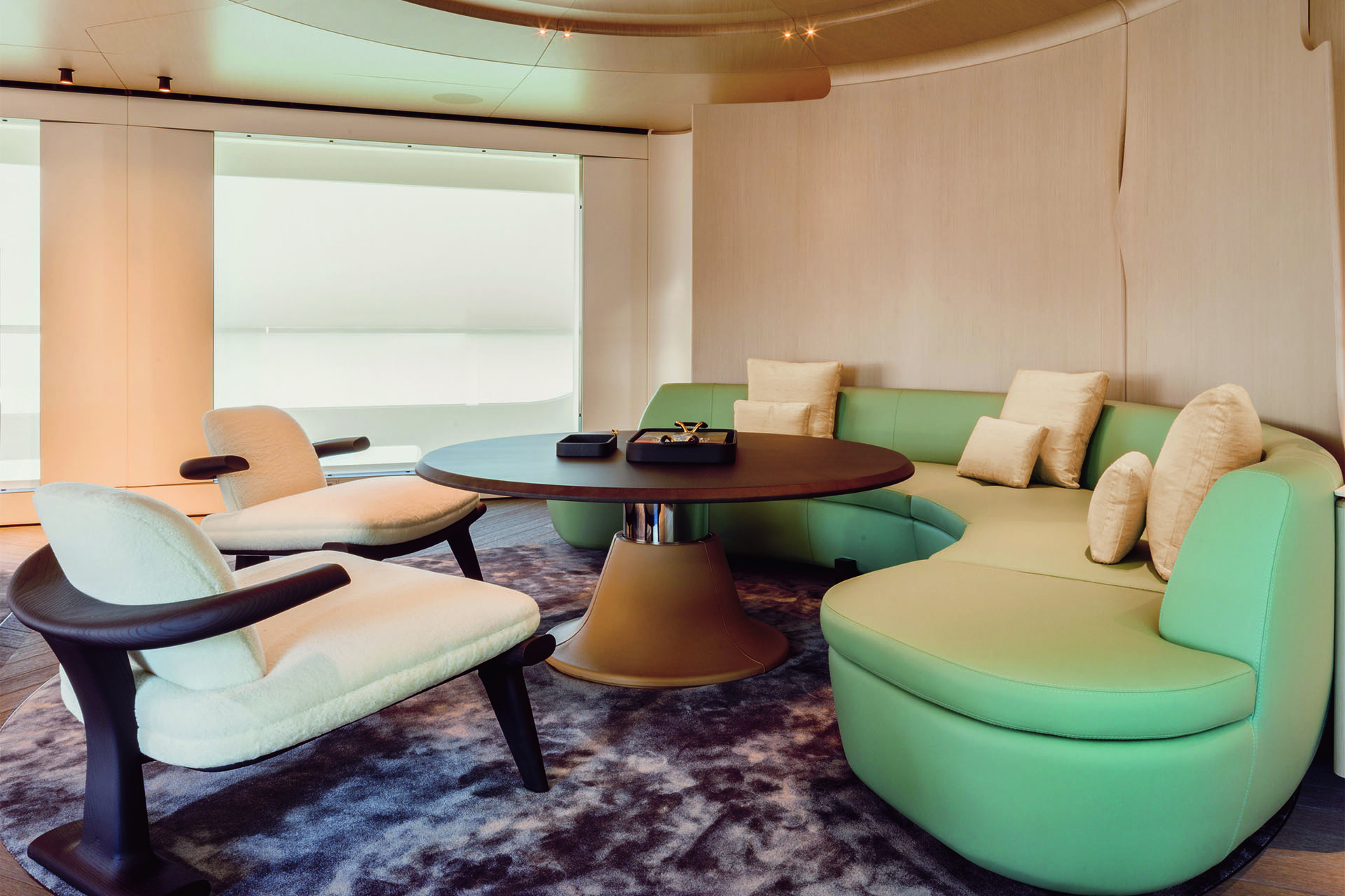In the main saloon, curved panels and gentle transitions create warmth and luminosity, complemented by the buttery tone of the interior wood. A circular ceiling feature includes a suspended water drop that spreads into textured ripples.
