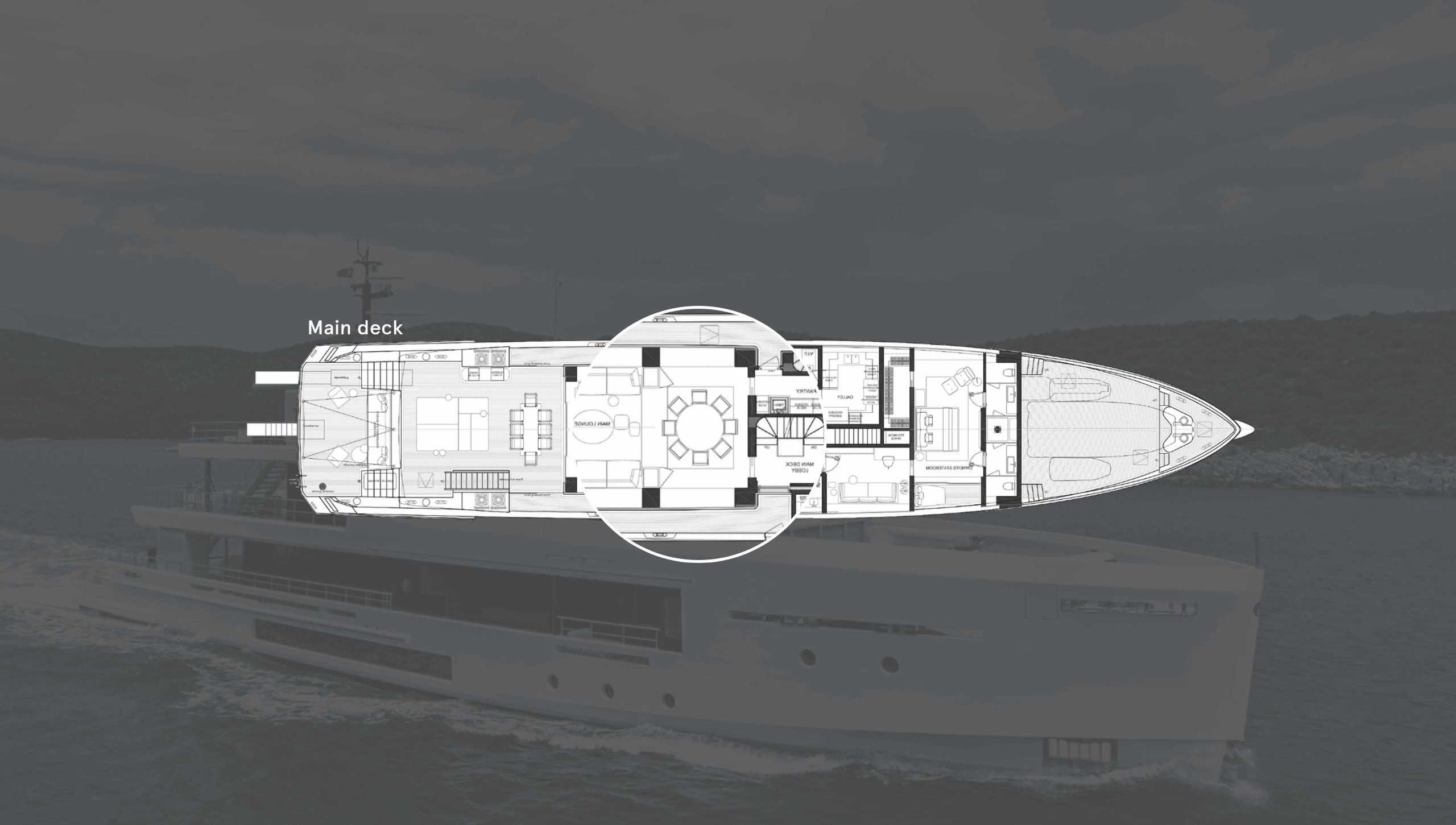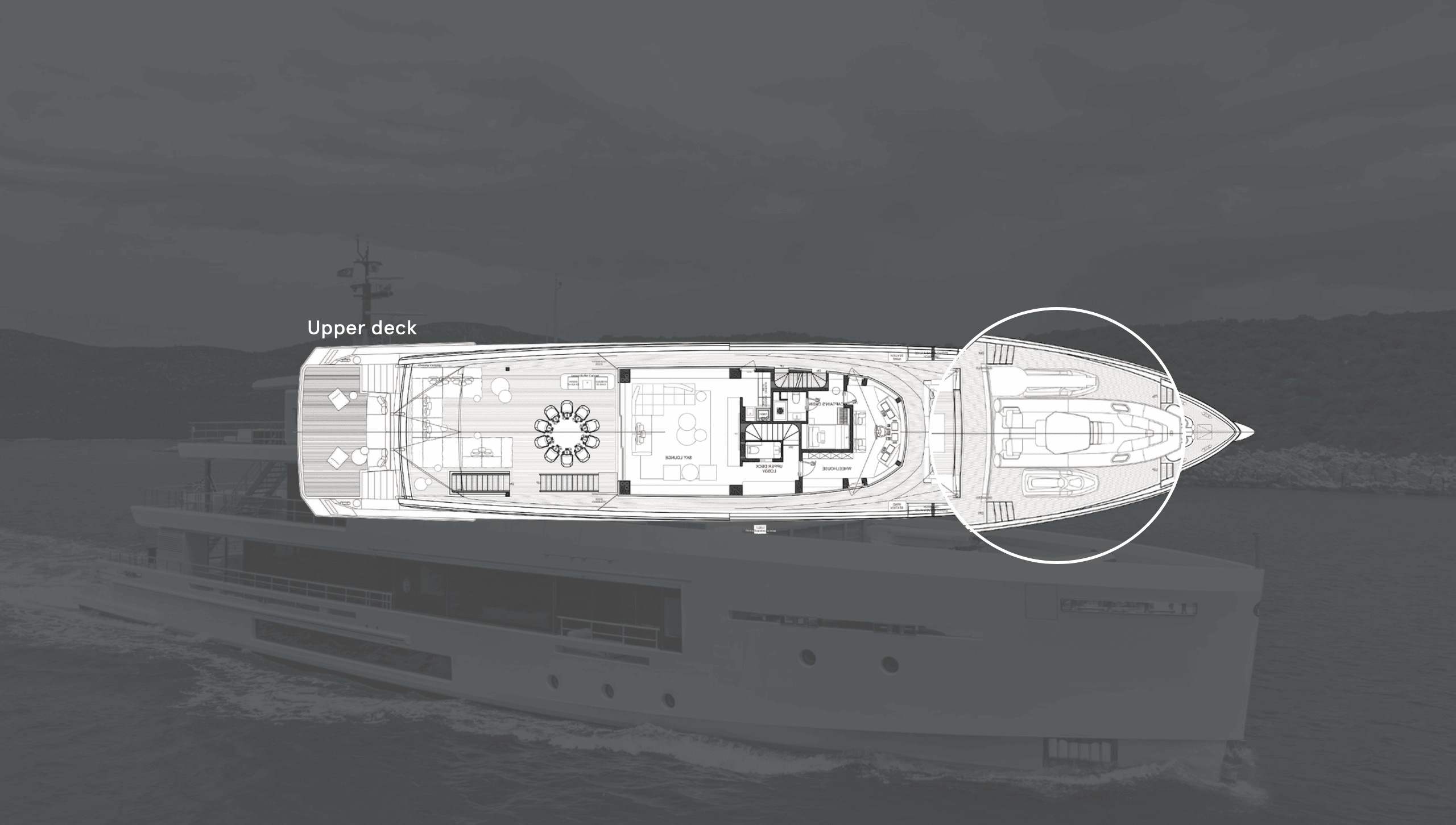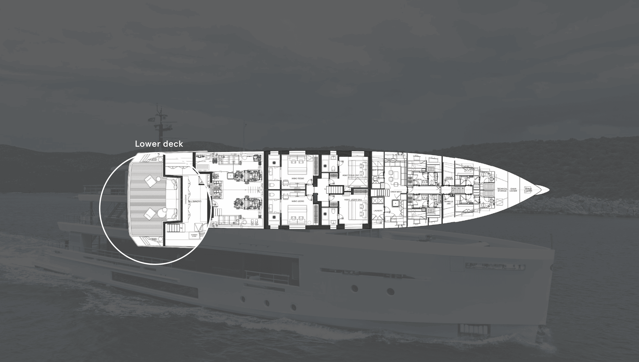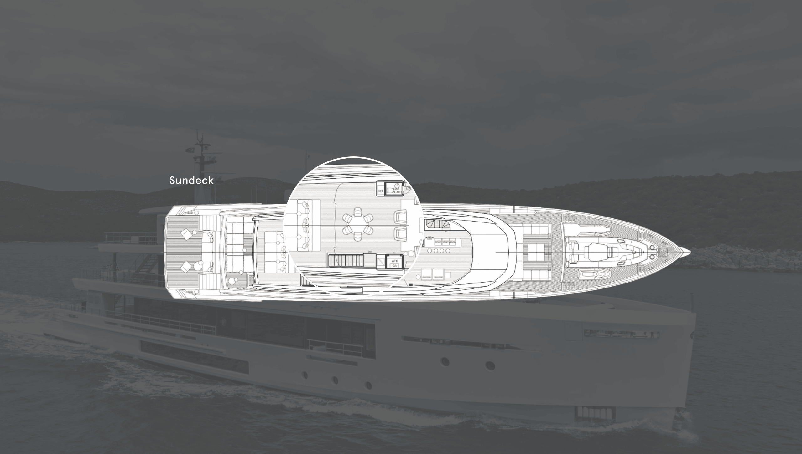 Plenty of shade from the sun was another owner request, yet with as much brightness as possible. The solution to the paradox came via large structural awnings on every deck that provide considerable overhangs, forward and aft, including on the fully covered sundeck – Cassetta’s favourite area on board.