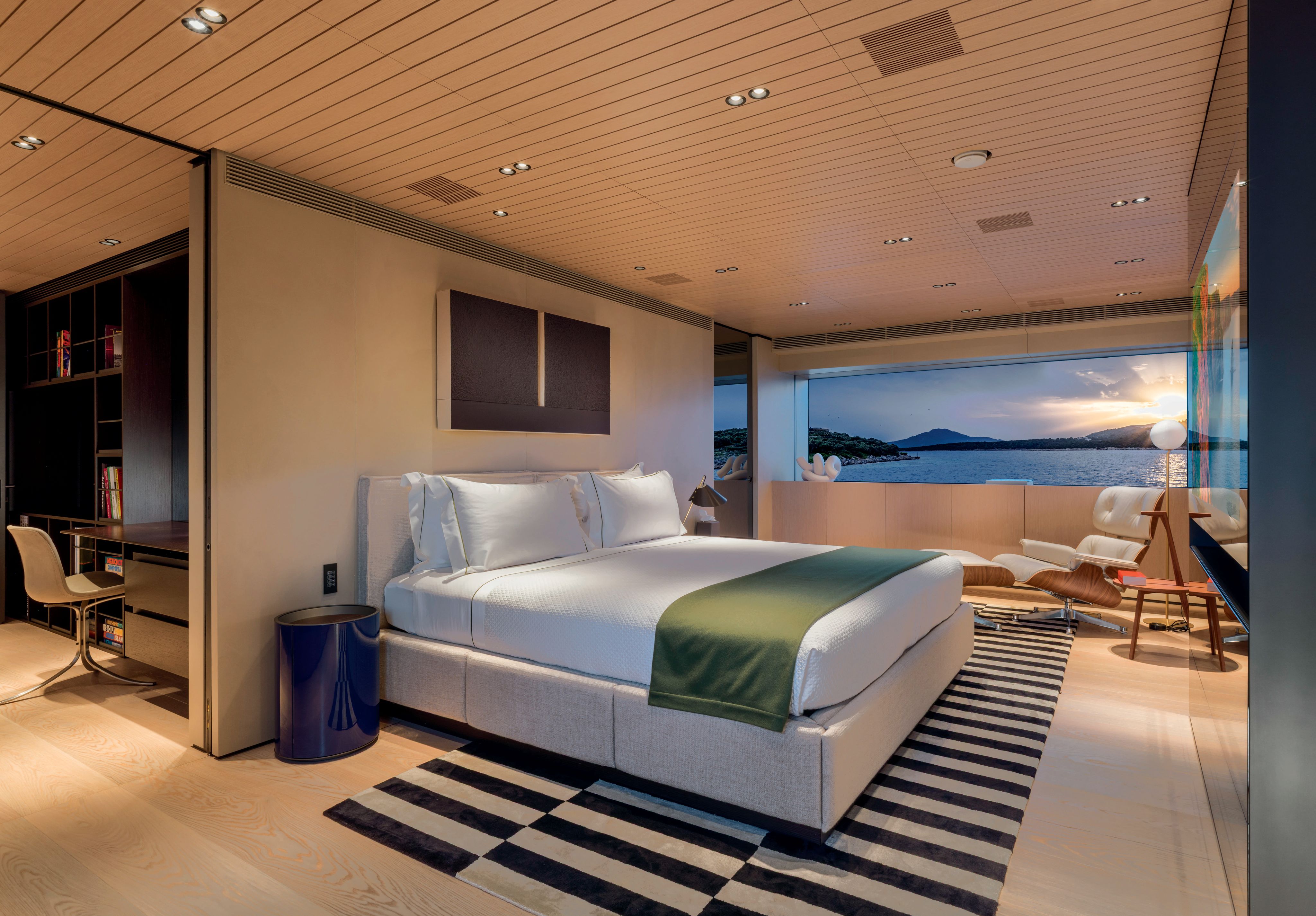 An integrated TV mirror takes pride of place, facing an abstract artwork that hangs above the bed. It’s one of many pieces of art and sculpture adorning the yacht, all taken from the owners’ private collection in a neat circle back to Cassetta’s original design intent.