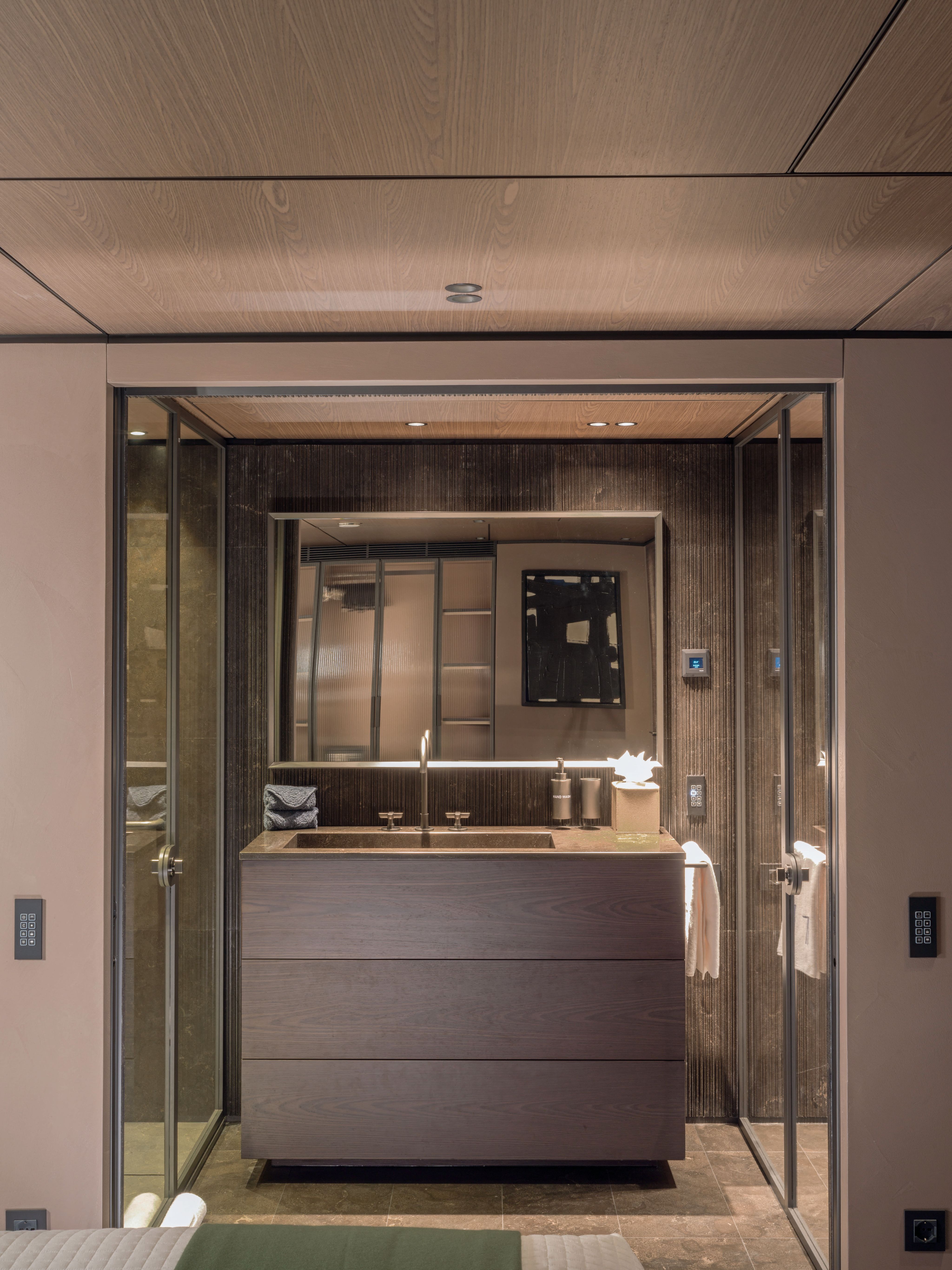 “Fold-down balconies require a crew set up, whereas this allows the owner to go from bed to balcony without interruption.” A walk-in wardrobe provides sufficient noise insulation from the neighbouring galley. The sizeable his-and-her en suite features ribbed crema d’Orcia textured stone and is connected via an adjoining shower.