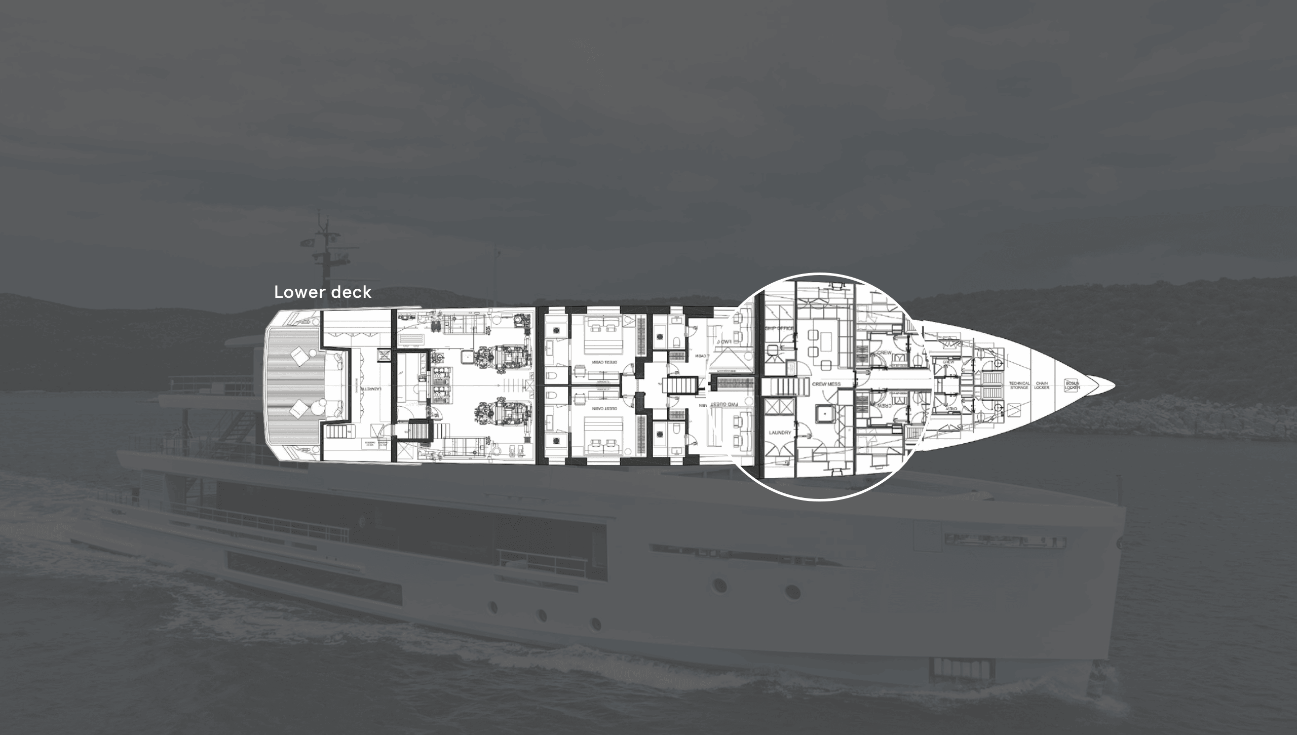 CREW CABINS Efficient space solutions continue into the lower deck crew accommodation. “A vertical bow helps to create expansive areas, and that comes into its own in the crew arrangements,” says designer Giorgio M Cassetta, highlighting the stepped position of the forward lazarette deck where the tender sits.