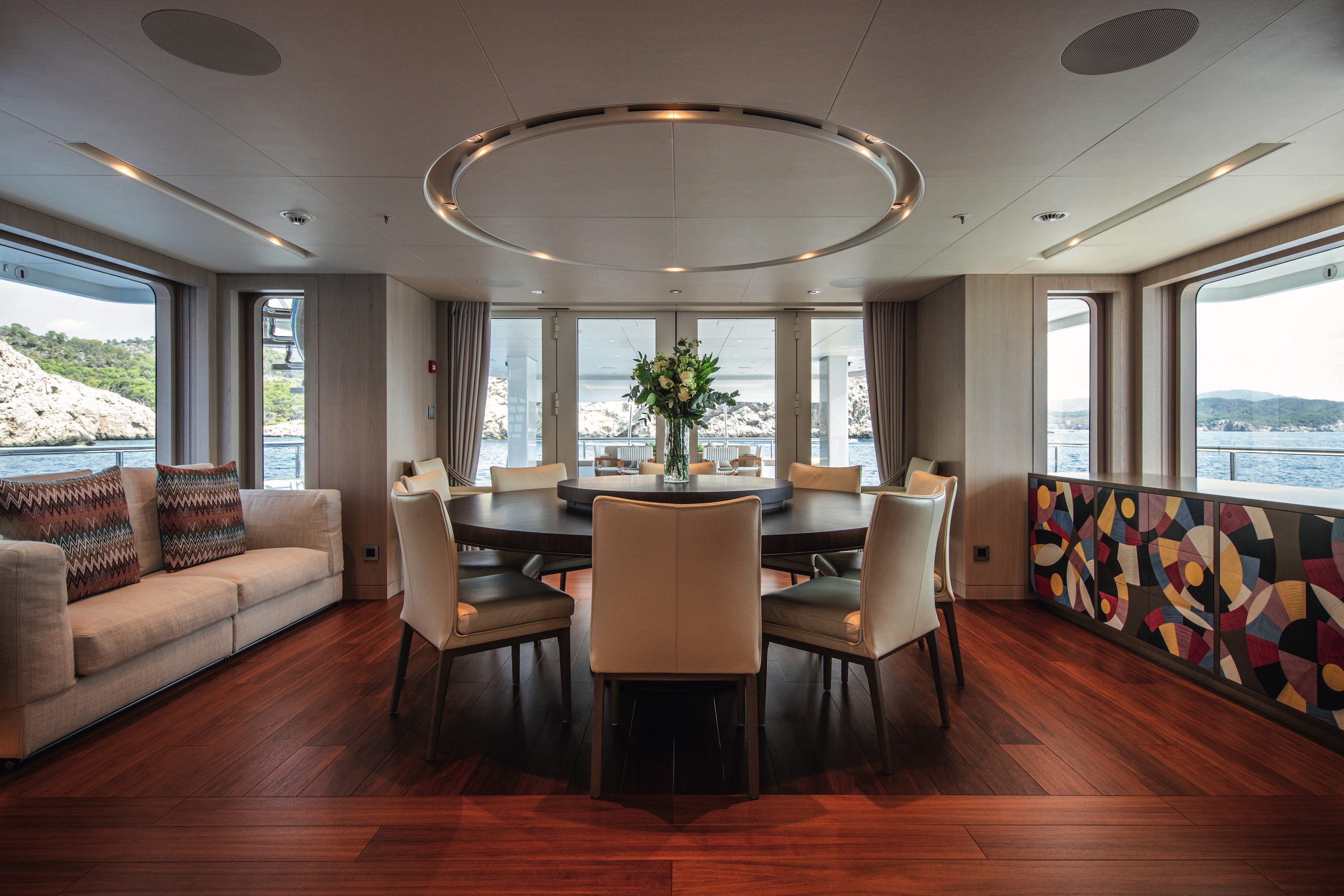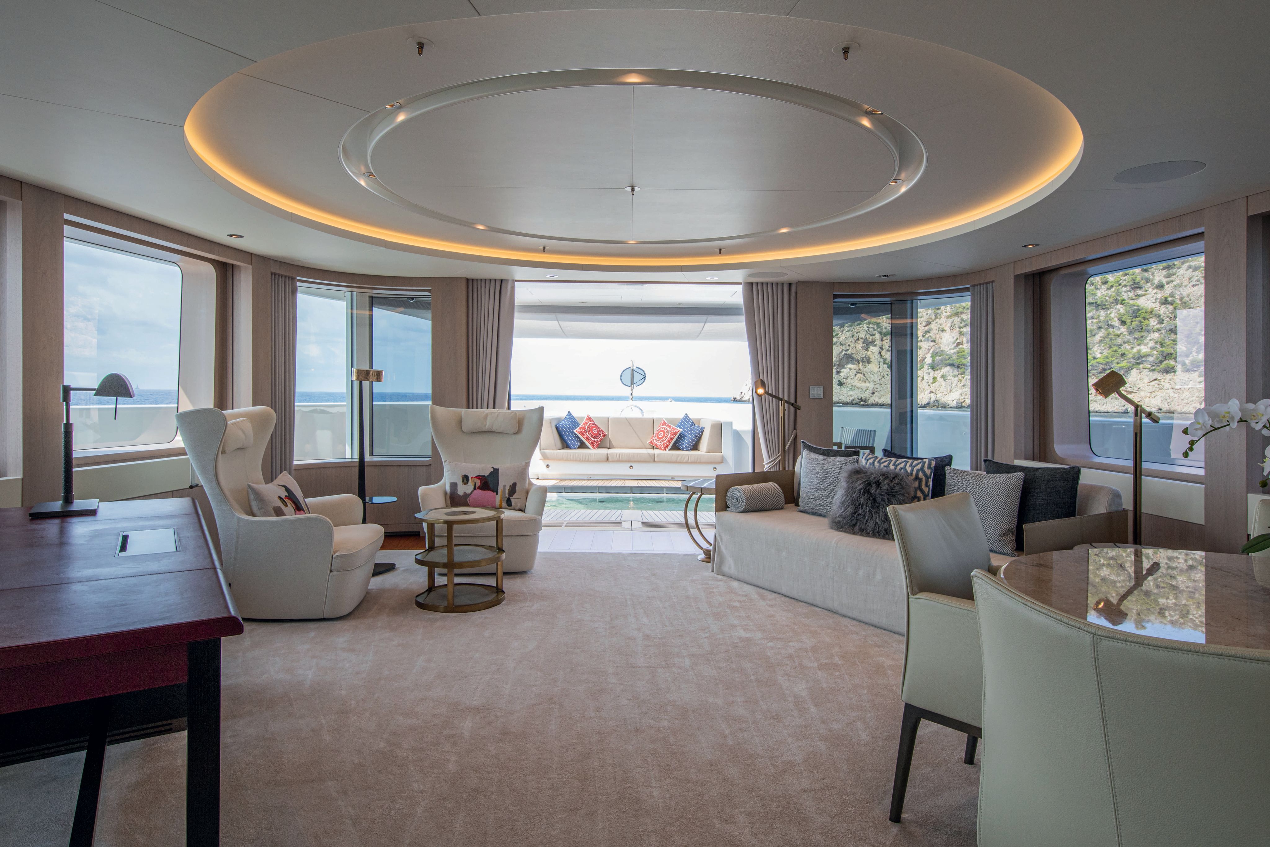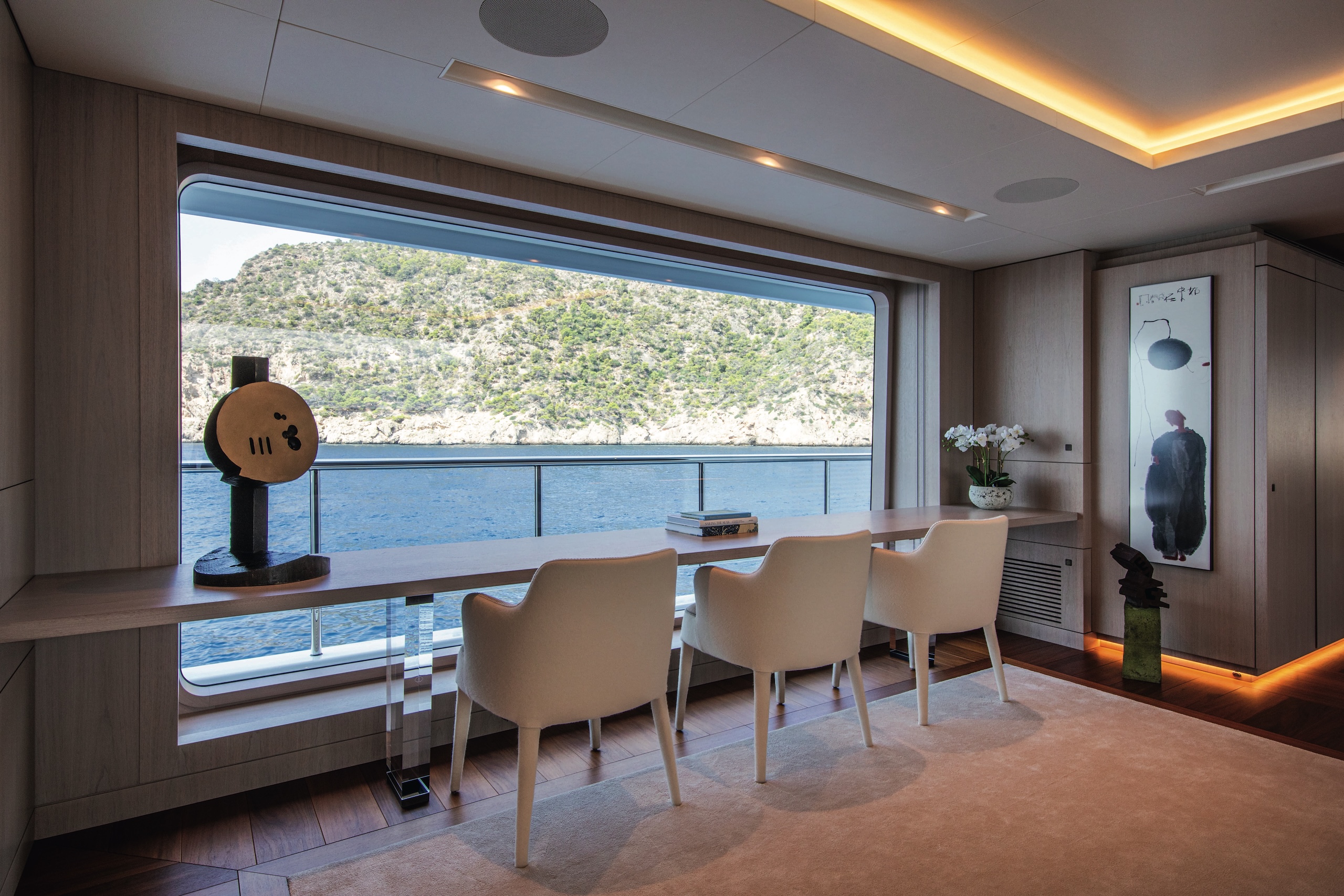 The observation lounge, aft on the deck, serves as the yacht’s principal saloon and shows off some of the yacht’s bespoke pieces, such as the dining table by Promemoria, the vibrant pop-art-styled credenza by Silverlining and bronze cupboard doors that feature the lyrics from John Lennon’s Imagine in cut-out, backlit form