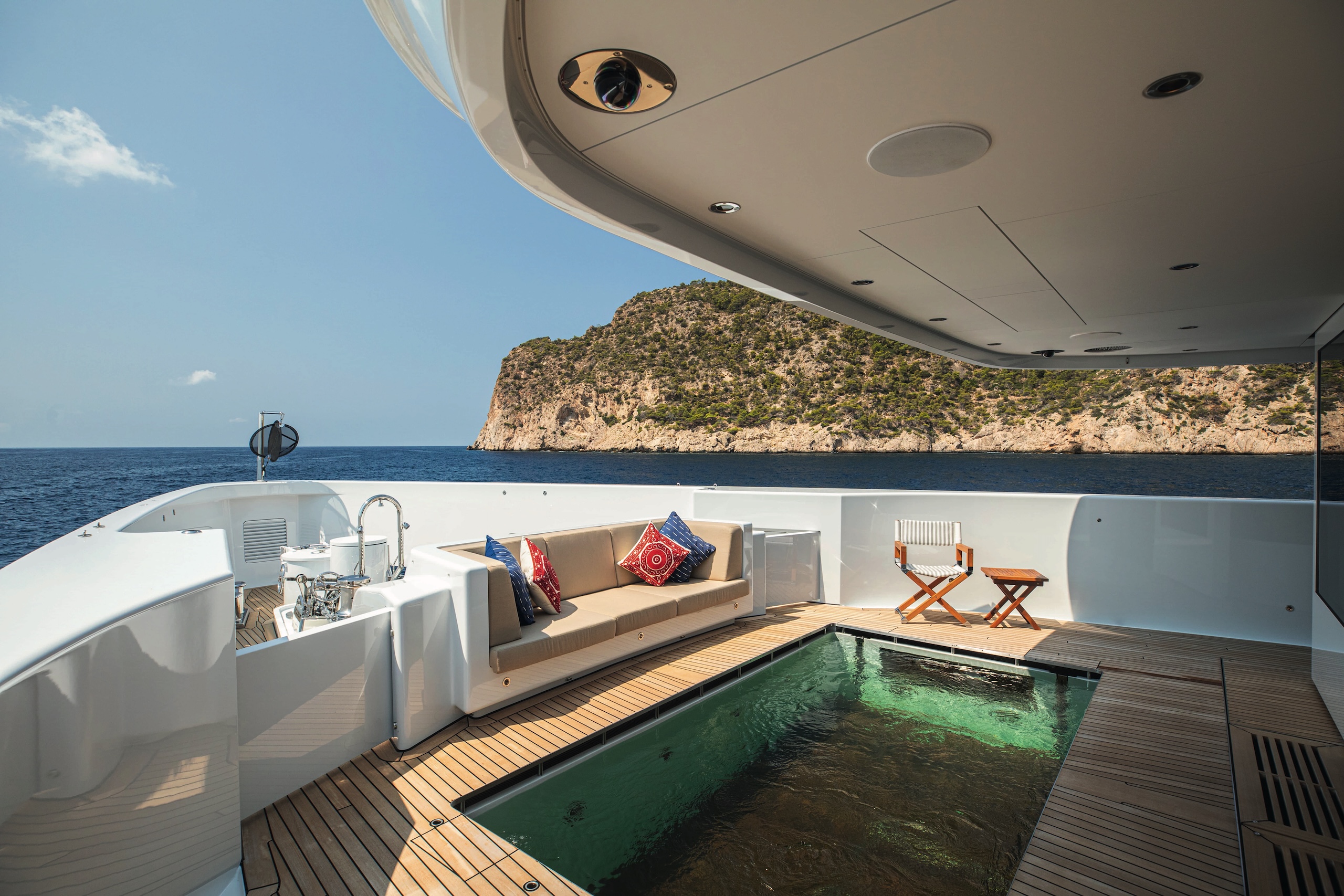 Dubbed the “cosy lounge” by the owners, the observation deck’s forward saloon leads out to a pool with counter current on the foredeck. New owners could transform the space into a master suite.
