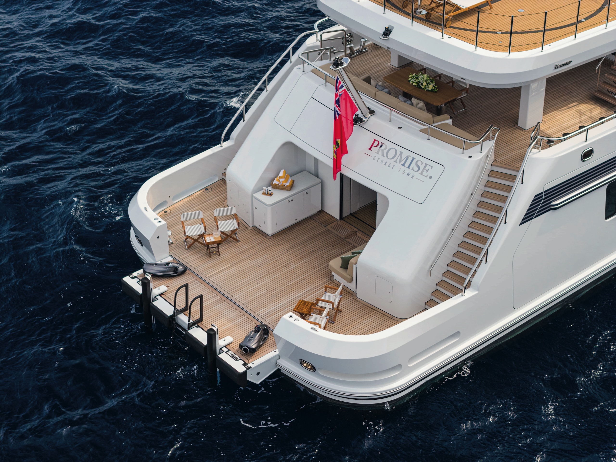 STUART PEARCE - YACHT SHOTThe swim platform is a generous space, ready to welcome guests embarking from the tender. It leads through the tender garage, straight into the main deck accommodation where four guest cabins and his-and-hers master suites await