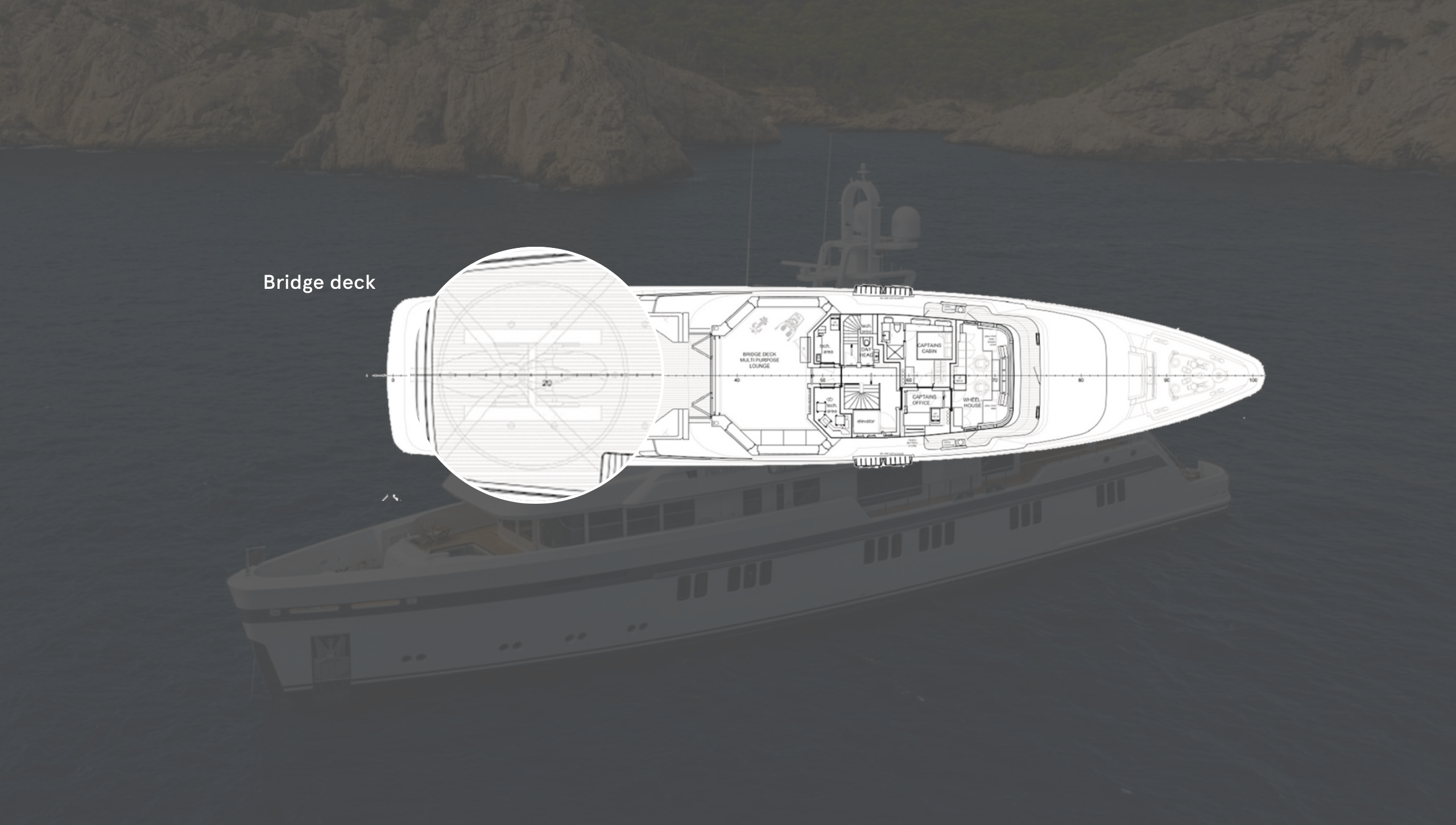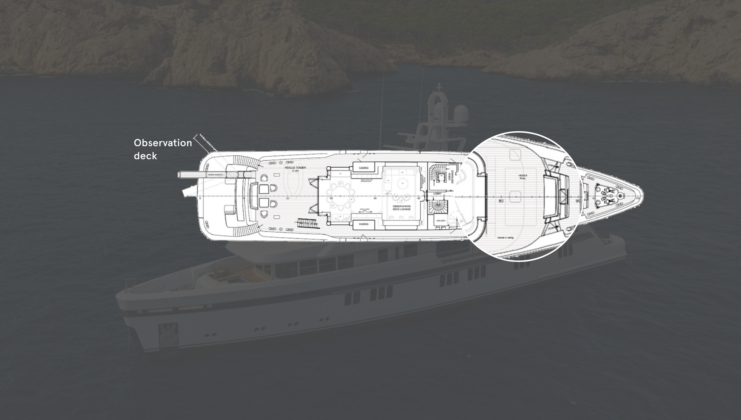The decks don’t follow the usual recipe. The main deck extends from the swim platform; the observation deck is above that, and the bridge deck tops all