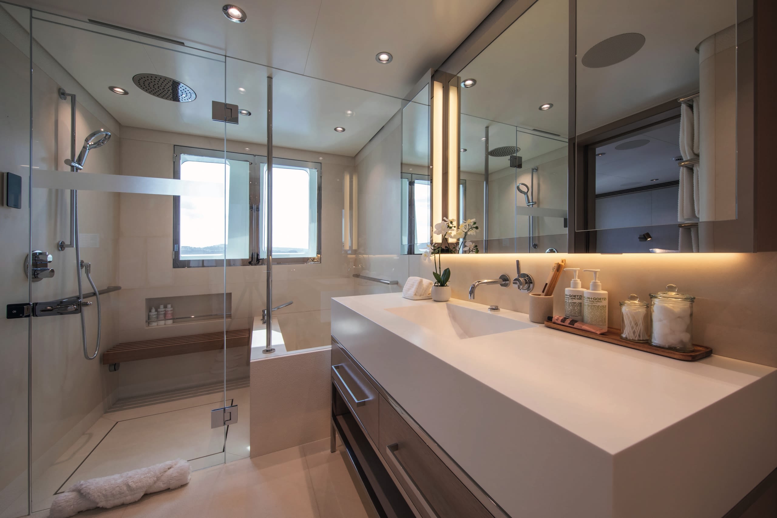 Dual master suites forward on the main deck are joined by a door. Both en suites feature steam showers and Japanese soaking onsen tubs, which was a first for Feadship.