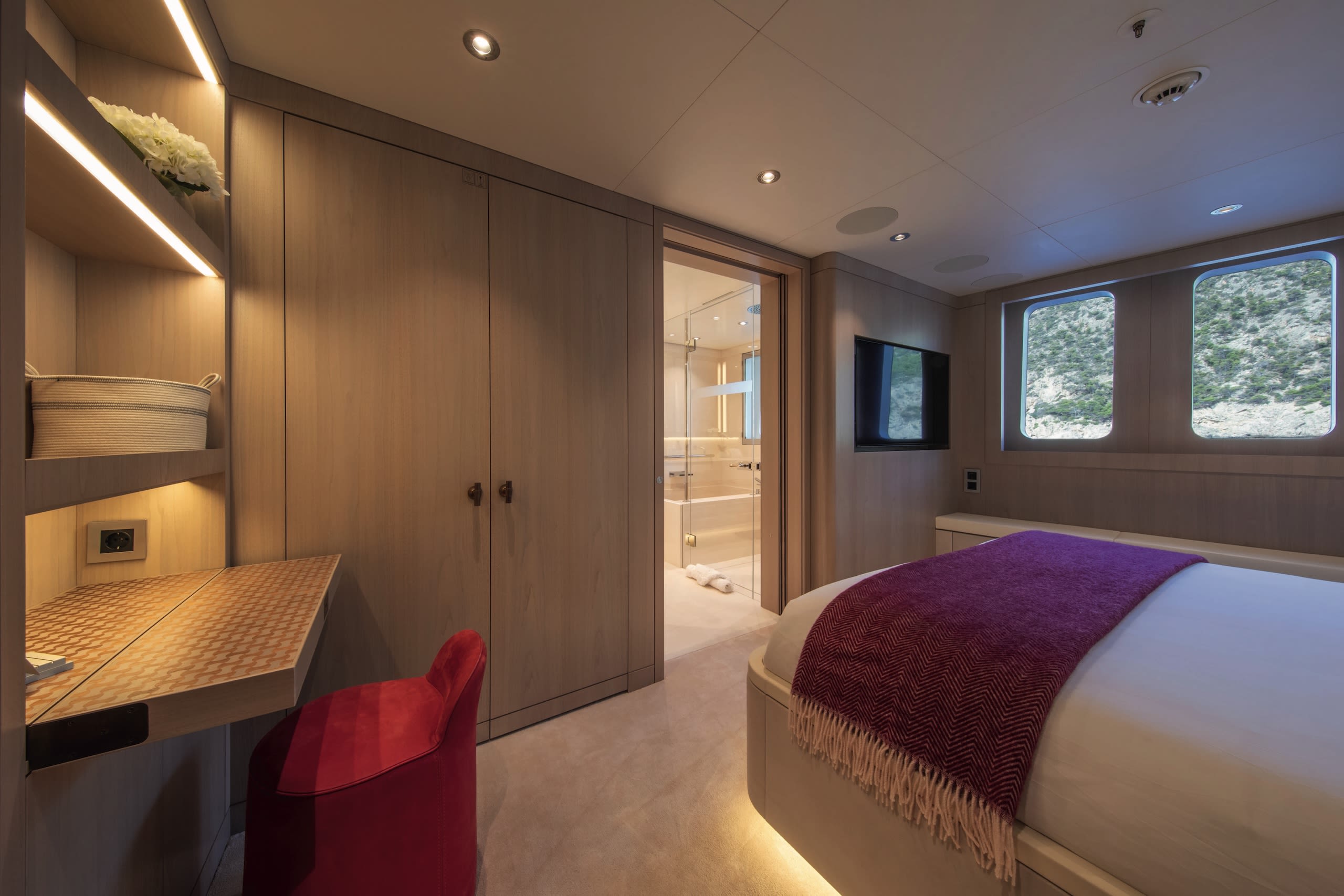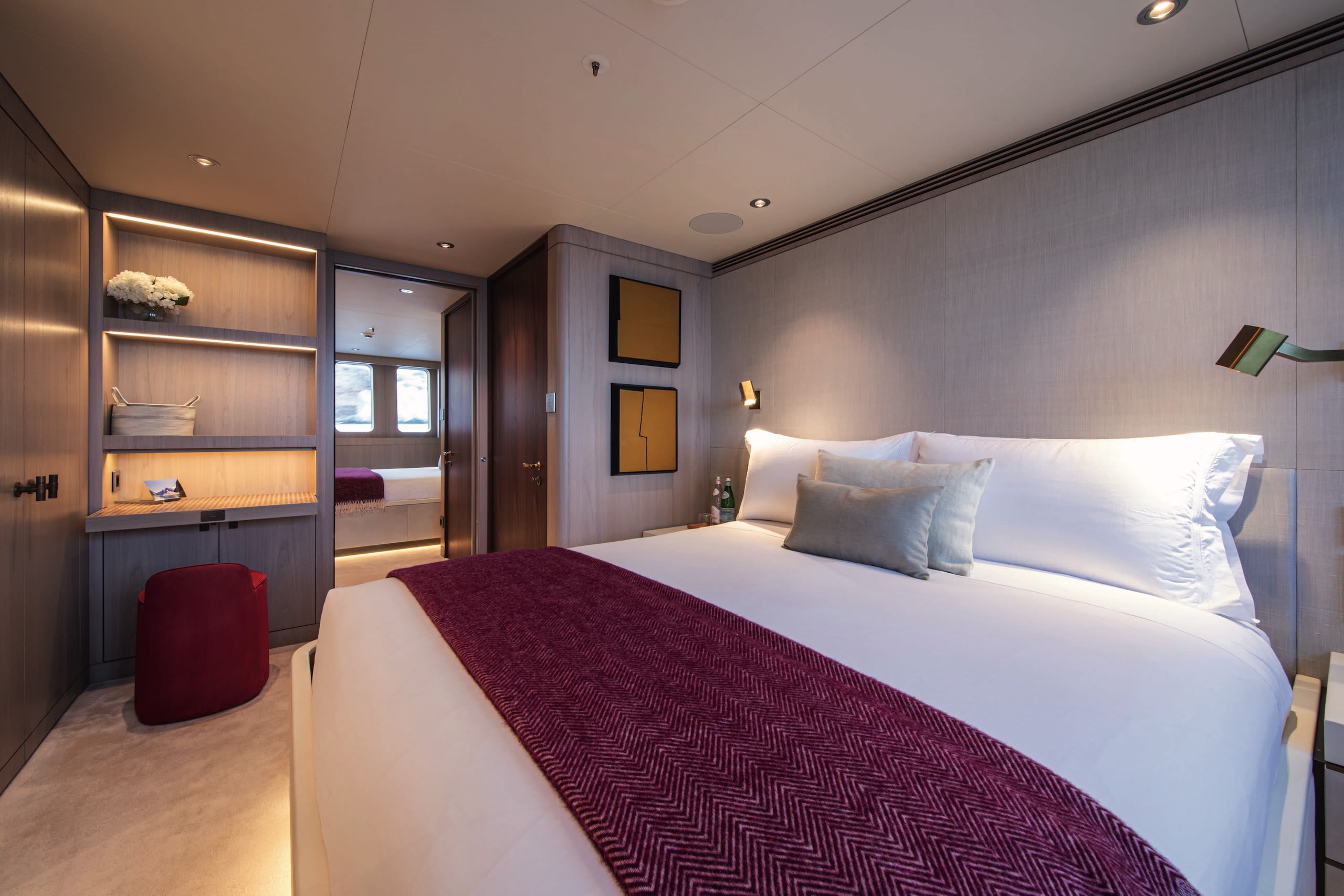 “It’s the first yacht to ever have an onsen bath on board, and it was certainly a first for Feadship,” says Hutchinson. The starboard cabin also has access to a private drop-down balcony.