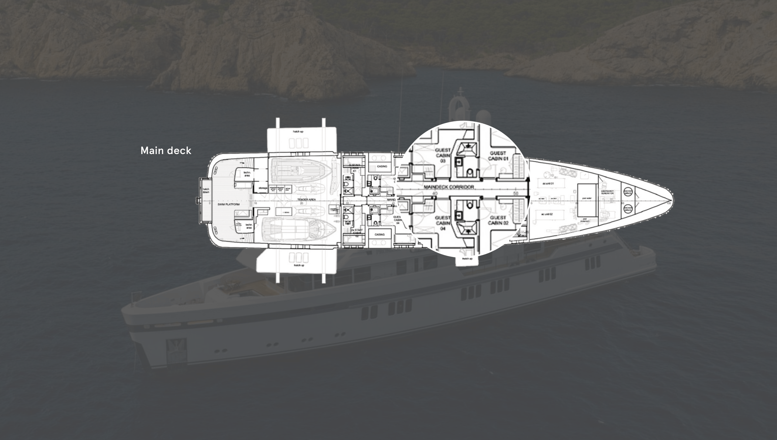 Forward of the swim platform is a large tender garage with side hatches for the easy deployment of water toys (two jet bikes, two jet skis and Seabobs) and the yacht’s two Pascoe International tenders. Beyond is a long, inviting corridor with doors that lead off to four spacious guest cabins – two doubles, two singles, each with an en suite – and two master suites forward at the far end.