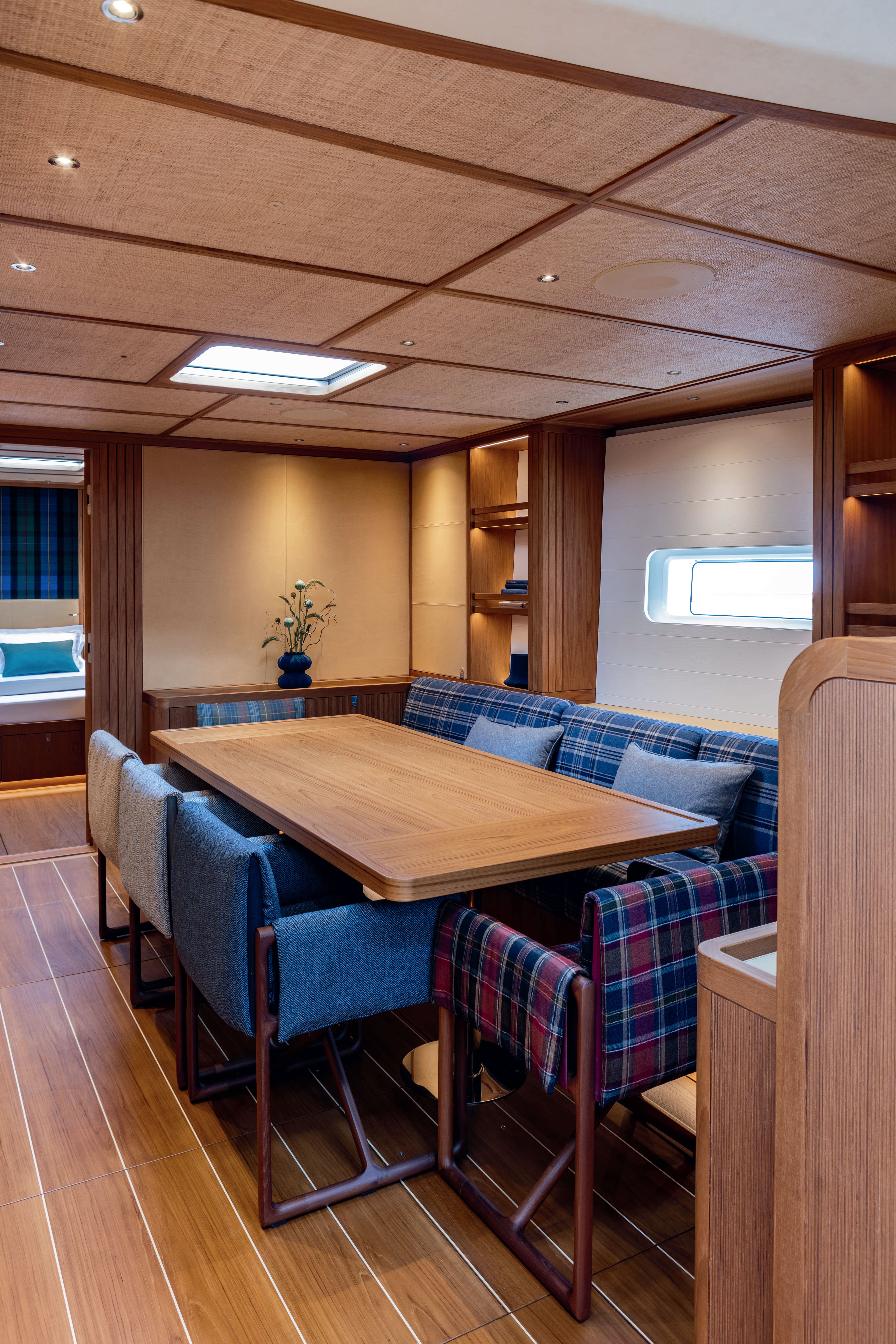There are warm, tactile tartans by Ralph Lauren with Colefax and Fowler on the sofas and daybeds, soft panelled leather hides by Fixafell on furniture and lockers that will age beautifully with use, textures like crown-cut cathedral teak on the sole, brushed to give it a haptic feel underfoot.