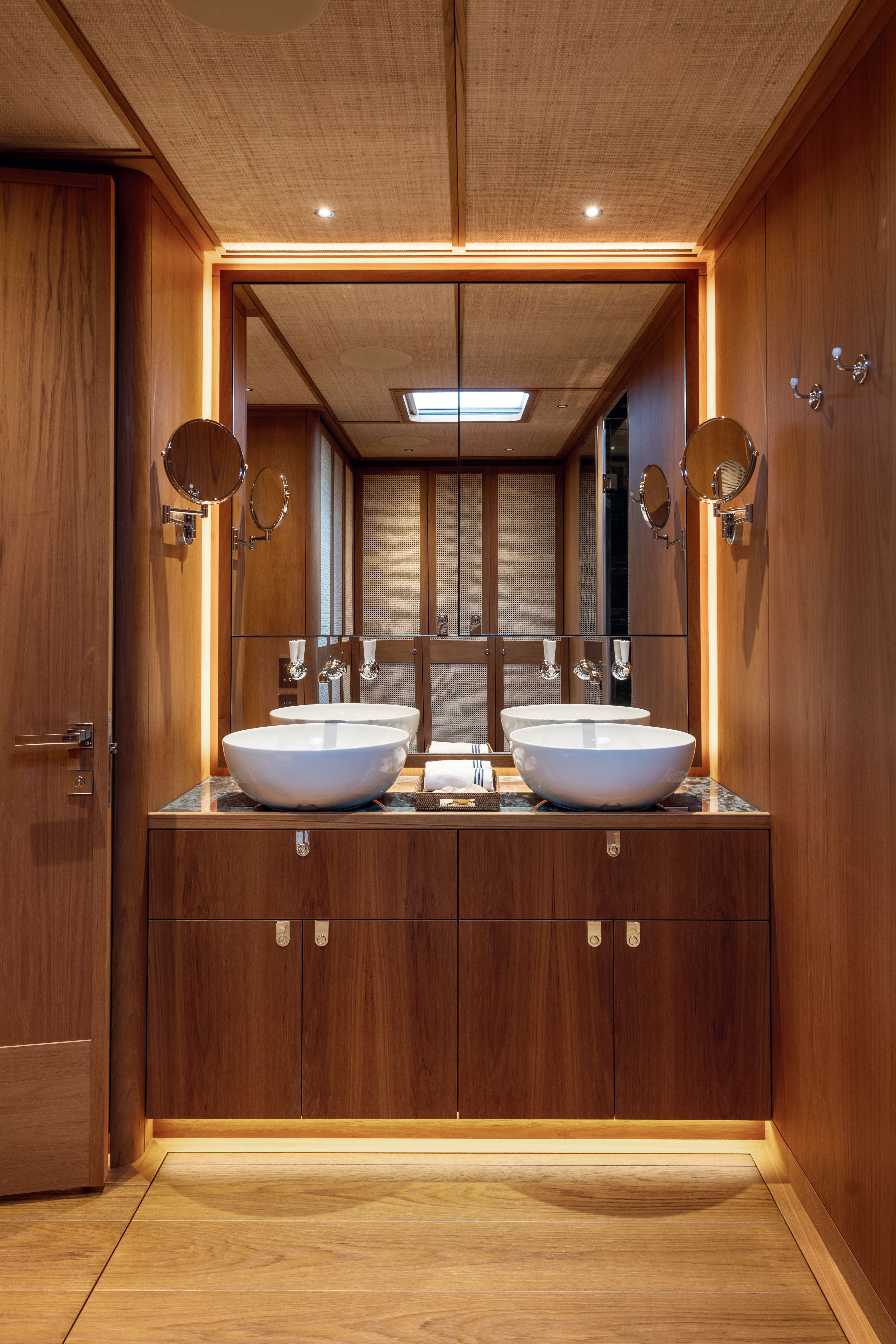 There’s brushed white ash panelling around the hull windows, vertical teak battens, cream Alcantara and teak-framed raffia on the ceiling, all centred by his-and-hers, custom Goyard trunks in the saloon.
