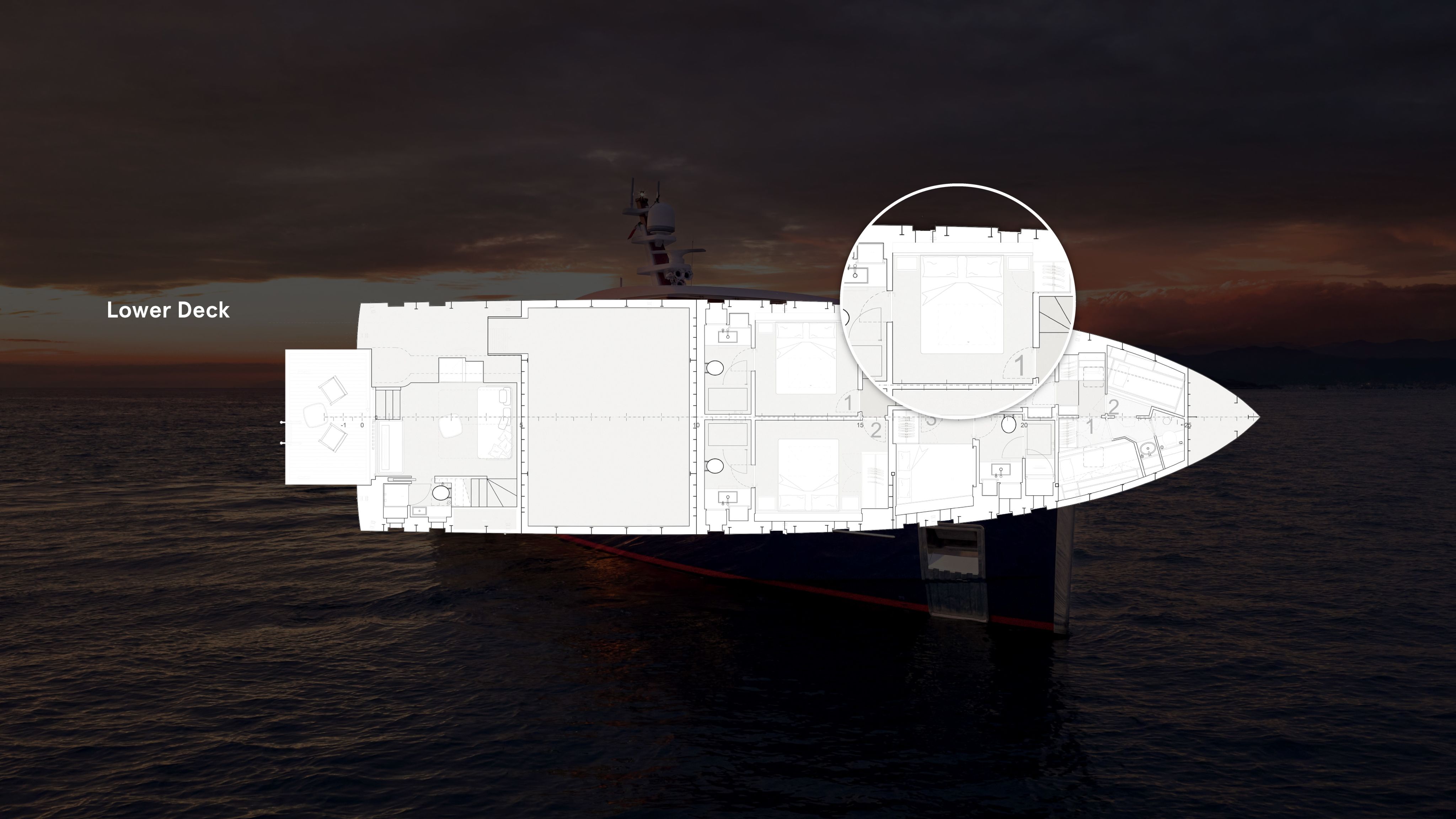 Dini declares with no hesitation that this is his favourite spot on board. “A 24-metre having that kind of beach club is absolutely stunning,” he says simply. In fact, it is considerably more than just a beach club, as the space has been set up as a convertible fourth cabin, with a comfortable sofa bed, retractable TV and a bathroom that also serves as a dayhead.