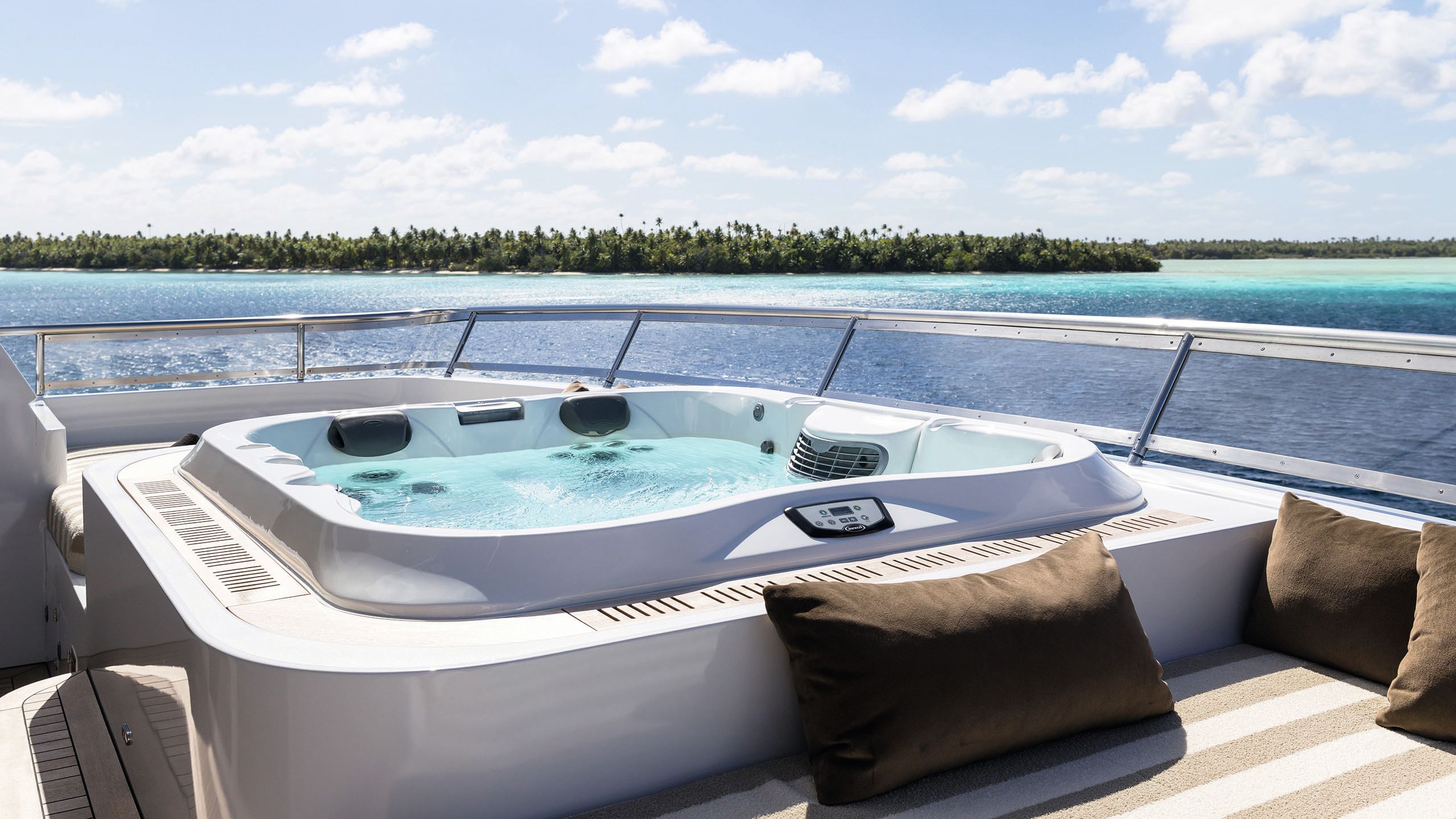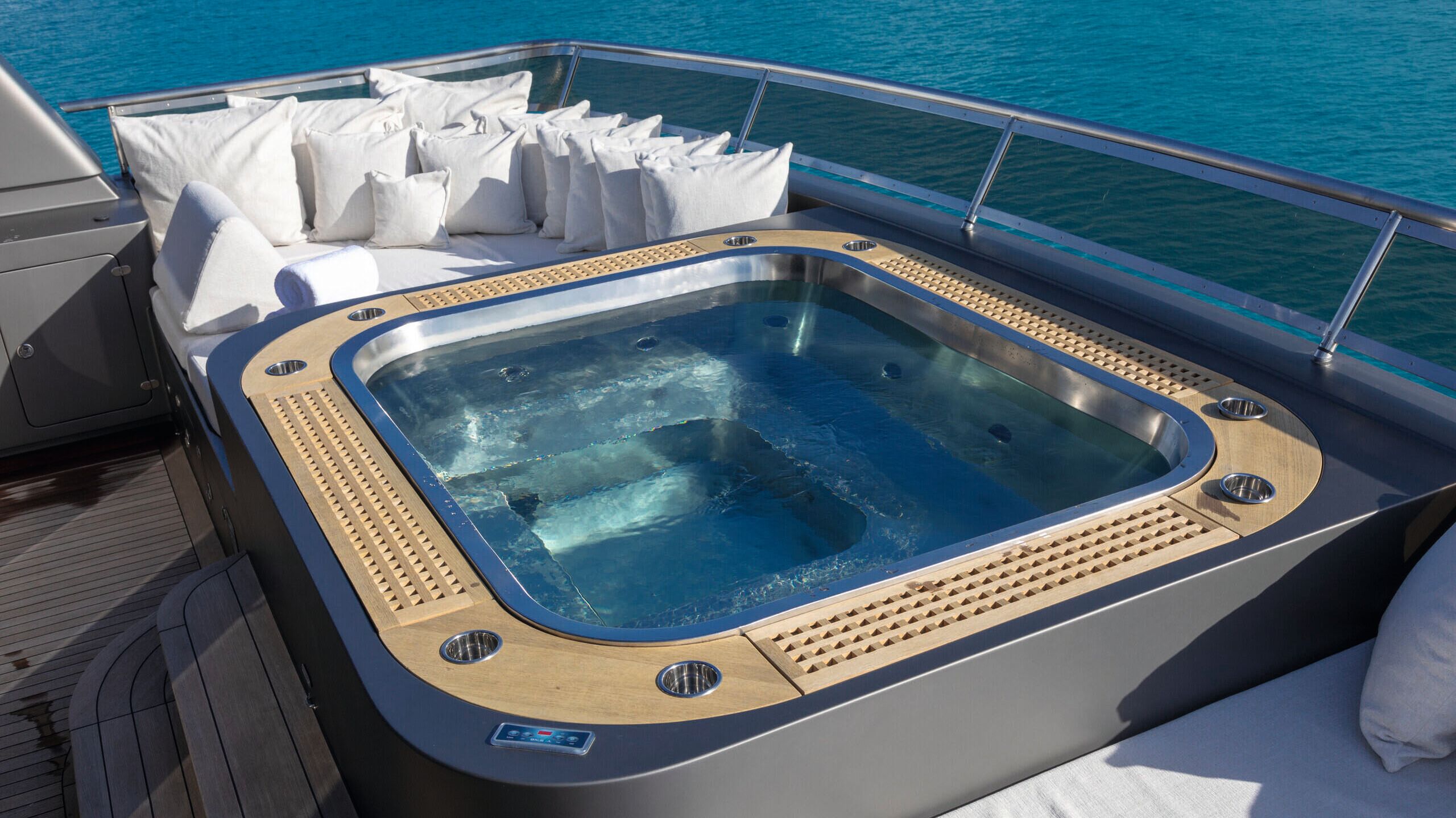On the main deck, Merzliakov switched the position of the bed in the owner’s cabin to the forward bulkhead so it offered panoramic views out of the windows. Aft, the fixed U-shaped settee in the cockpit has been reconfigured as a walkaround unit. “For charter and for functions you should be able to walk right around the deck,” Merzliakov says, “especially when you have events and fireworks and music, so there’s a lot more scope for people to enjoy the deck with this configuration.”