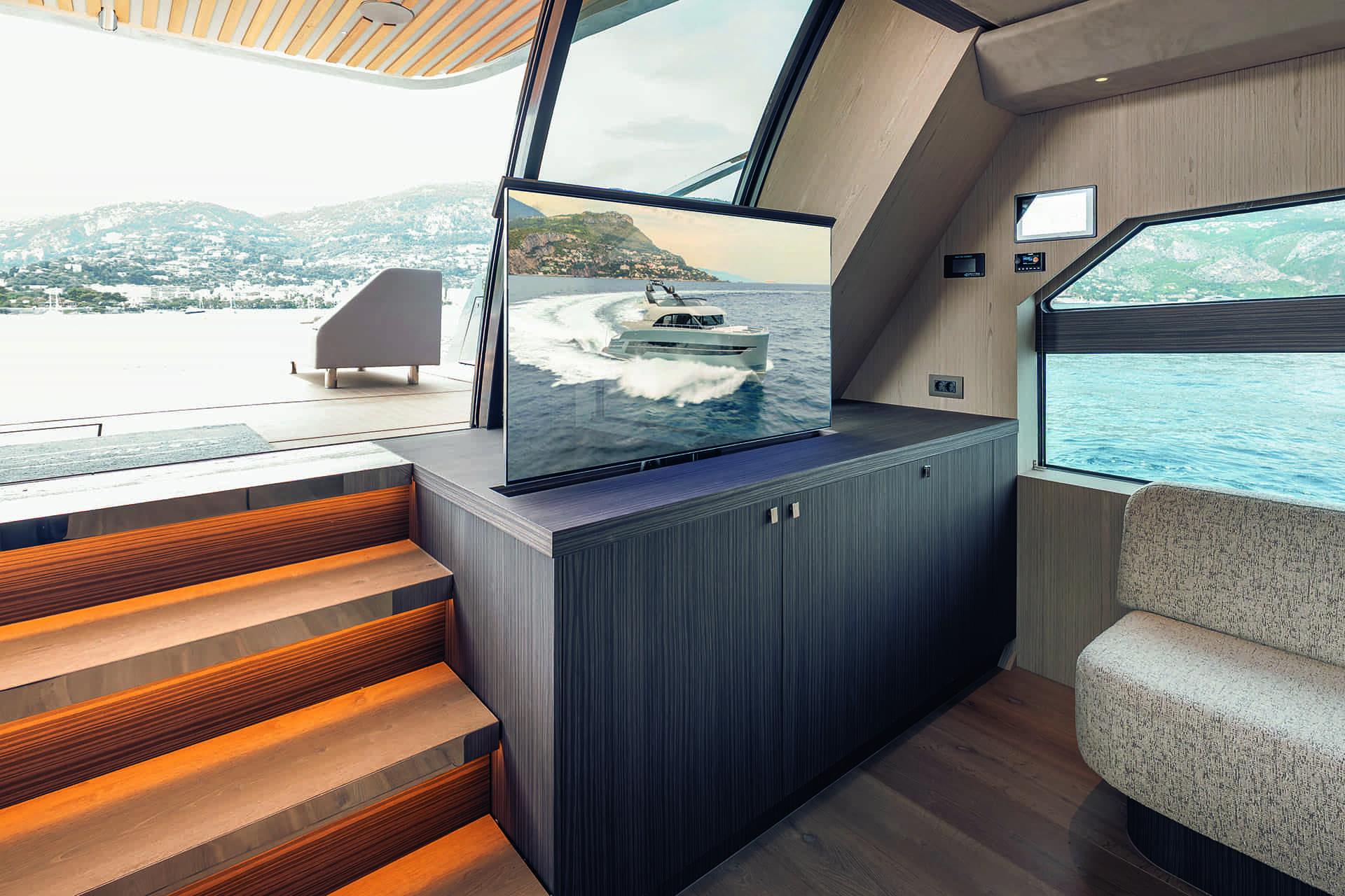 The outdoor seating arrangement aft of the main saloon features height-adjustable tables that also move laterally towards the corners of the U-shaped sofa. The space can accommodate up to eight people and is partially shaded by the flybridge overhang. There’s also a remote-controlled bimini that extends out for further shade.