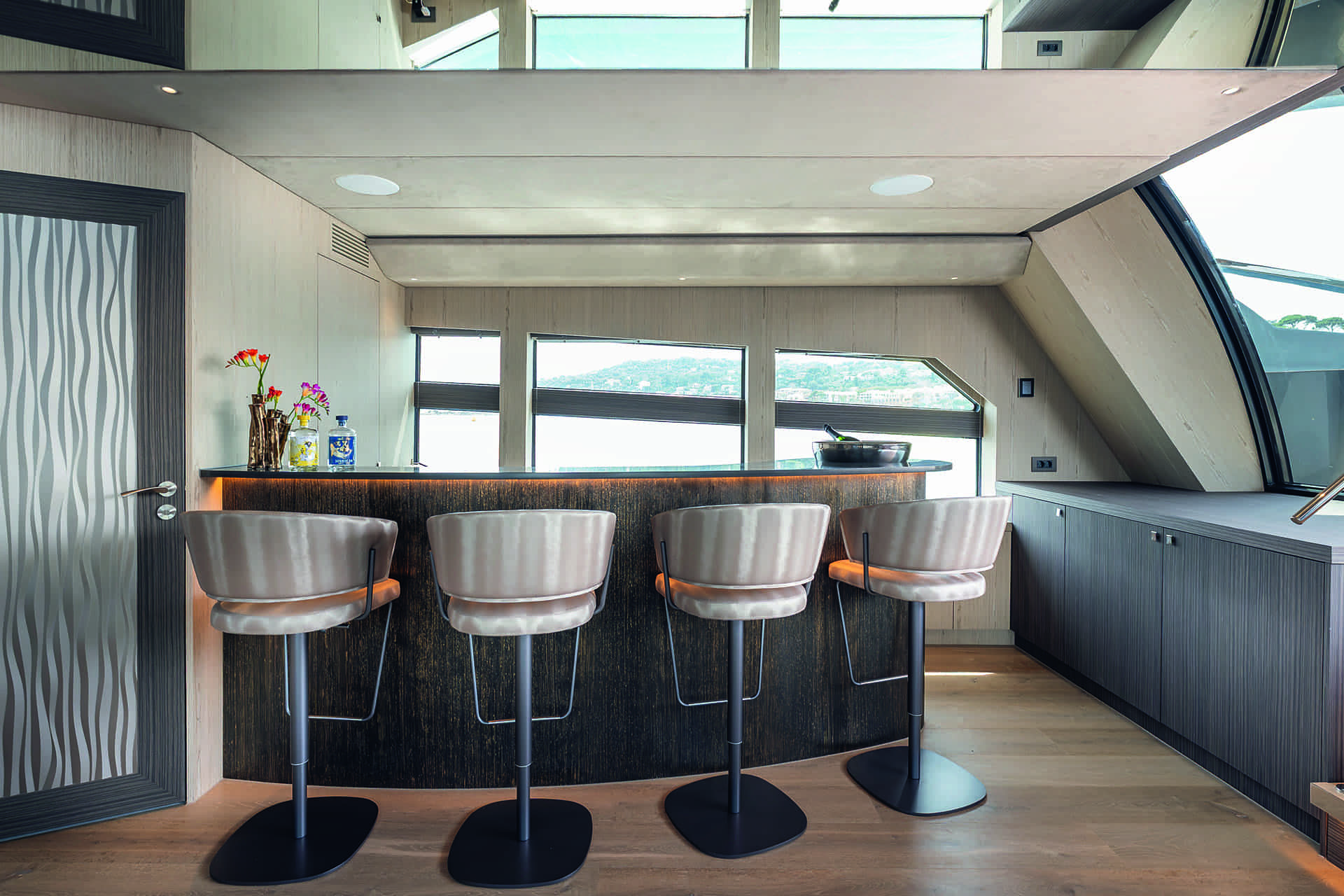 The surprises continue inside, essentially from the moment guests step down from the beach club into the awaiting lounge. The space is made bright and welcoming thanks to a panoply of warm woods and large wrap-around windows, but the real showstopper is the full-size bar to starboard that looks to be dripping metal. It’s a production technique honed specifically for the new model by a local Dutch artist, with rich gold undertones catching in the light.