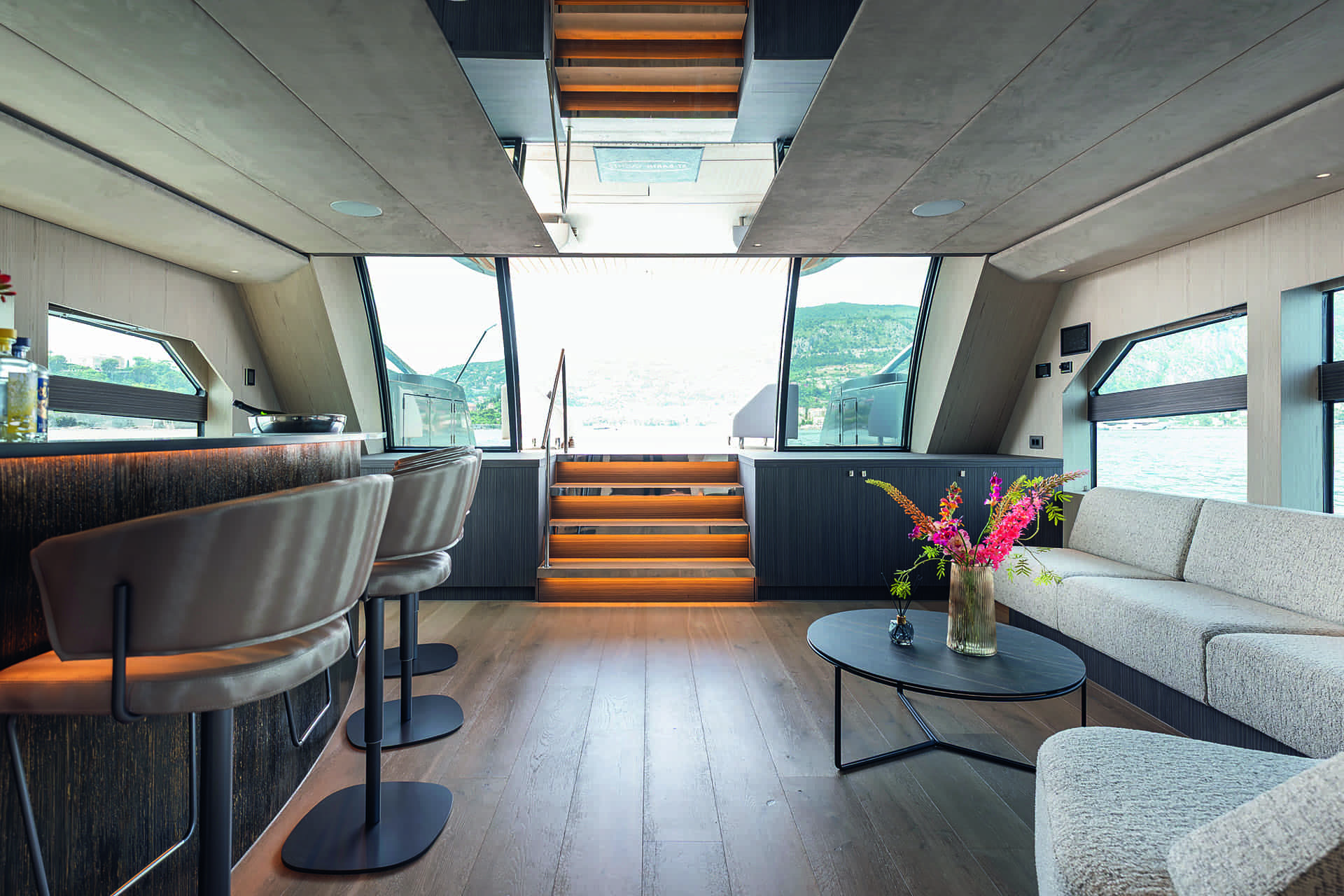 “We wanted to have several places where you can enjoy with friends and family or be on your own,” Woudstra says, directing our attention to a cosy-looking daybed just aft of the formal dining table.