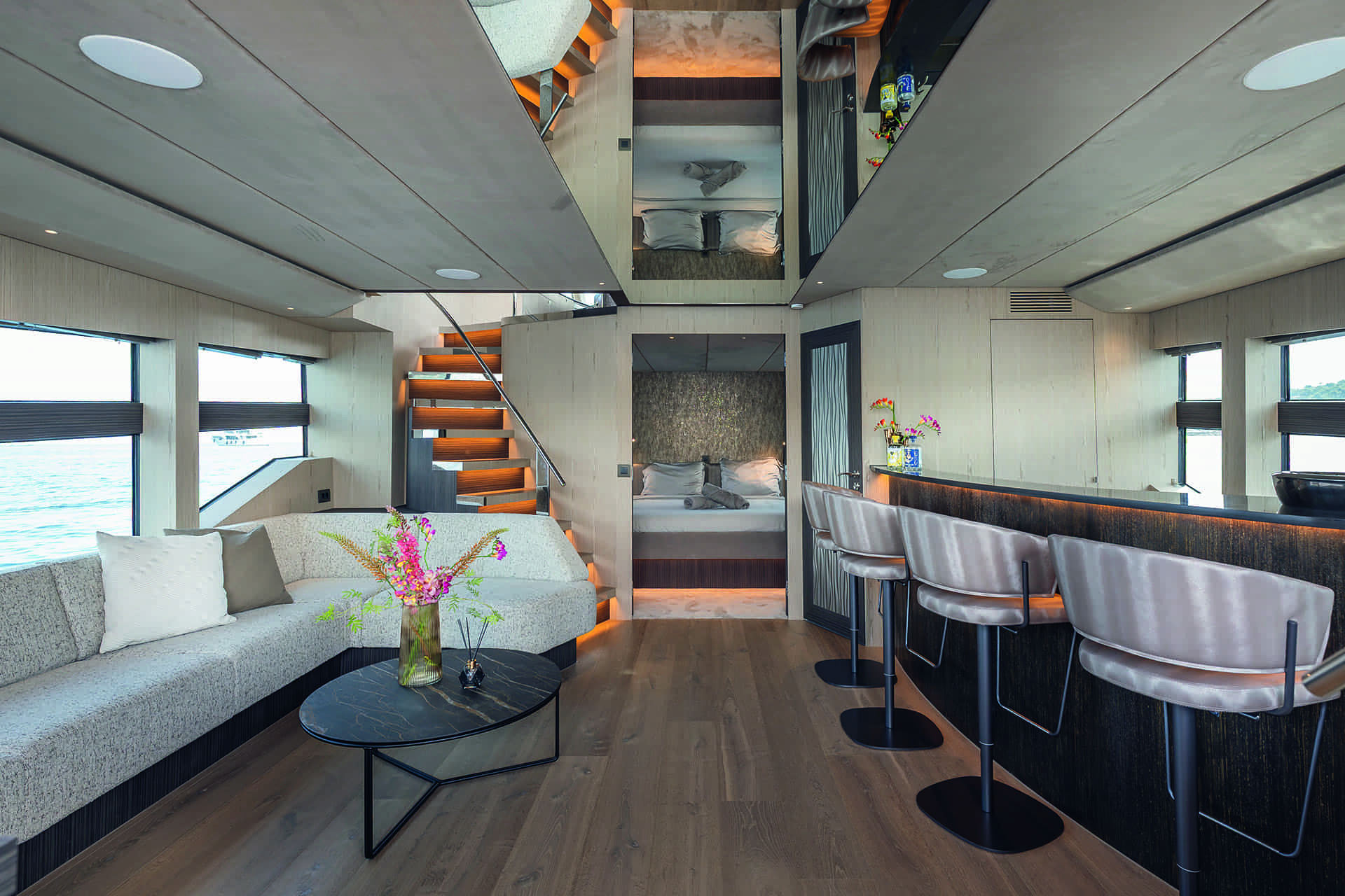 In a break from convention, the full-beam master suite is situated directly forward of the lower deck saloon. “I like the use of the different spaces on board,” says Kohlmann. “Frank [Bart] has quite a unique approach to solving problems.”