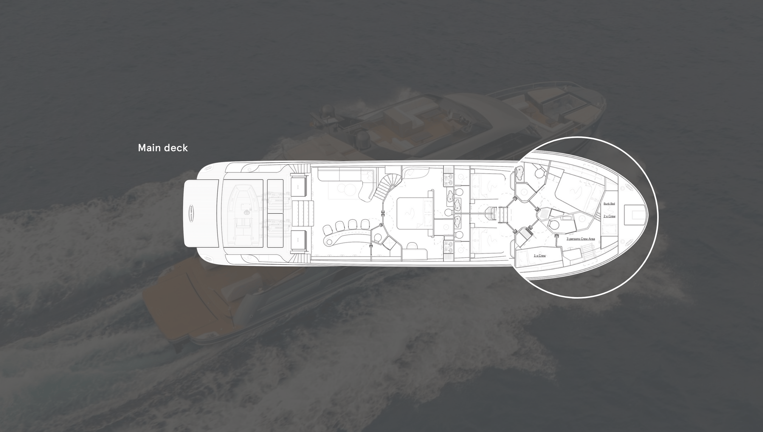 The rooms can be partitioned by a set of double doors, though leaving them open effectively creates a private owner’s apartment with direct access to the aft deck – perfect for a morning dip. The remaining guest cabins (two VIPs and one further double) are found in the forward section next to the crew quarters, which can be swapped out for an additional guest accommodation should an owner-operator prefer to forgo crew.