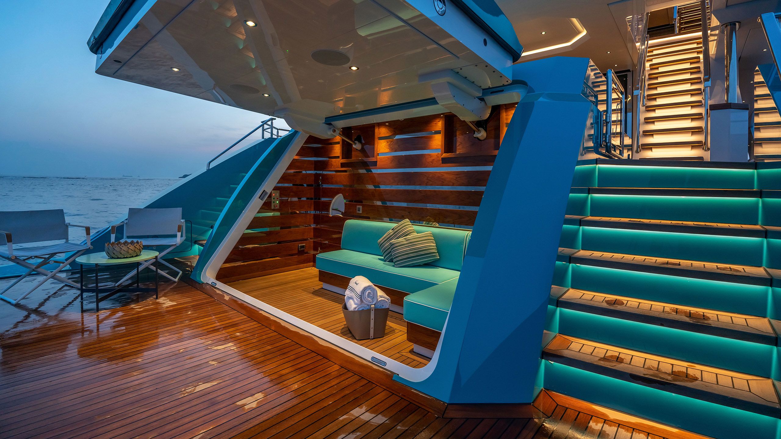 The galley has discreet side-deck access for crew, and an adjoining spacious dining area