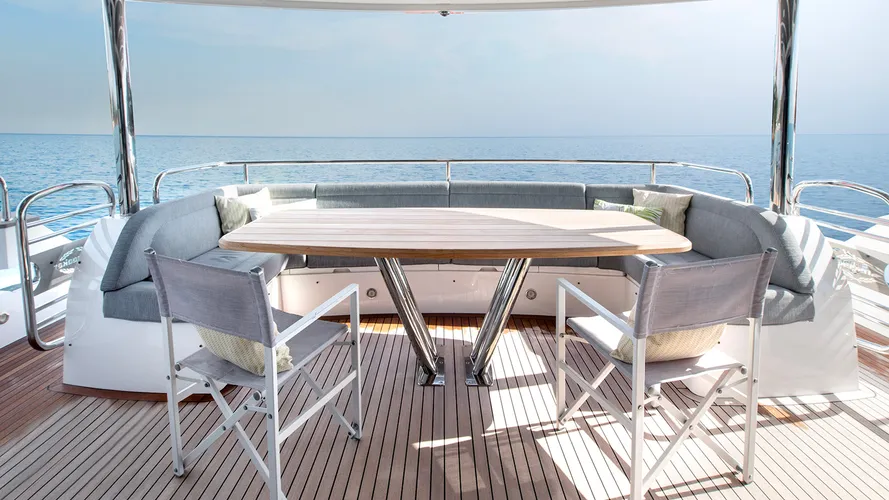 Her top speed is 26.0 kn, her cruising speed is 24.0 kn, and she boasts a maximum cruising range of 1250.0 nm at 10.0 kn, with power coming from two MTU diesel engines. She can accommodate up to 10 guests in 5 staterooms, with 4 crew members waiting on their every need. She has a gross tonnage of 102.0 GT and a 6.55 m beam, and she is built with a Teak deck, a GRP hull, and GRP superstructure.