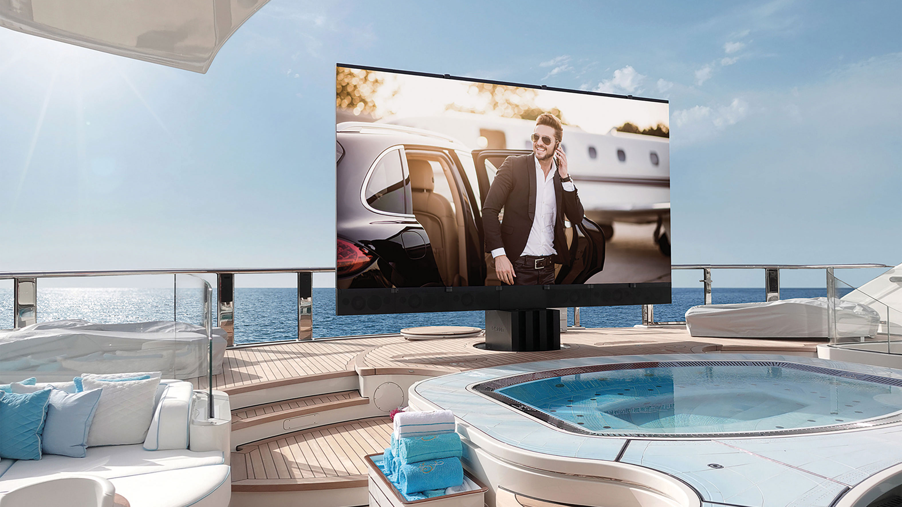 A C SEED TV isn’t just larger than conventional screens, which typically max out at 100 inches. “It can rotate up to 180 degrees for use between different areas or decks. Imagine a swimming or spa pool on one side and dining or seating on the other. The TV can be positioned in the middle and rotate between areas,” he says. “Most of the yacht projects we work on require customisations to the TV to make it fit, and we’re happy to do this.”